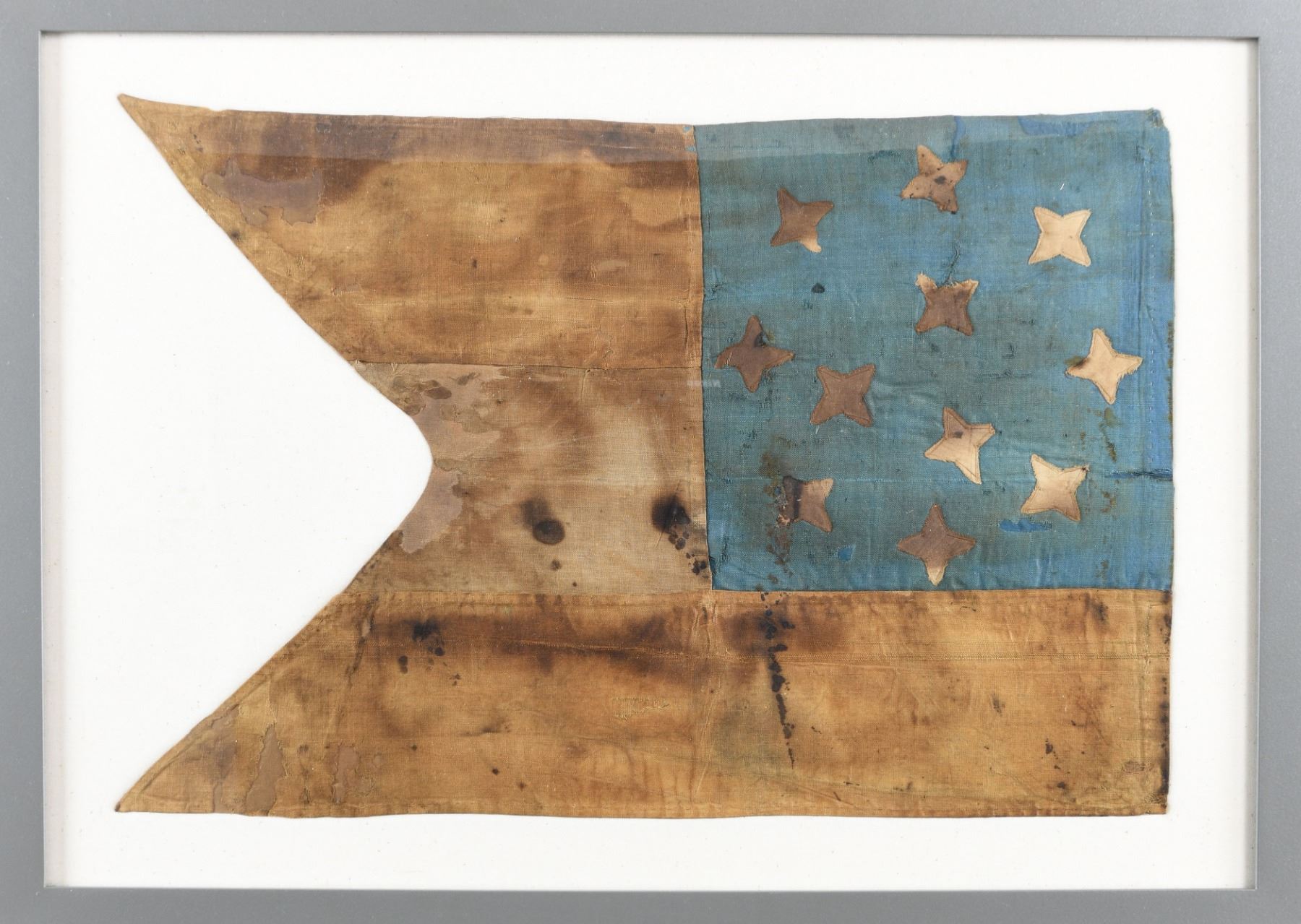 OF RICHMOND, VIRGINIA. This rare cavalry guidon was likely sold by the firm of Burger & Brothers of Richmond, Virginia as early as 1862. Scholarly research has shown that this guidon was likely made by Constance, Hettie, and Jennie Cary, also of Richmond. These three fine ladies of the South are also credited with producing the first Confederate battle flag. A receipt does exist from Burger & Brothers that is dated January of 1862, billing the Confederate States of America for 283 lances and flags. This guidon, and the lance in the following lot, are believed to be the exact types sold by Burger & Brothers of Richmond to the Confederate Government. The guidon measures approximately 16 7/8" x 11 1/4" and features a blue canton measuring 7 1/2" square. The canton has 11 edge-sewn, 4-pointed stars, 8 of which are arranged in a circle with an additional 3 stars inside the circle. The field consists of a central white stripe measuring 3 1/2", with a red stripe above measuring 3 7/8" and a red stripe below measuring 3 1/2". The distance from the tip of the swallowtails to the central low point is approximately 5 1/4". This guidon is archivally mounted in a gray metal frame measuring 15 1/2" x 21 3/8". CONDITION: this guidon has tremendous visual presence, evoking thoughts of brave Confederate cavalrymen charging in support of their cause. Overall, the guidon shows staining, with some minor losses that have been professionally backed with archival material. Naturally, there is fading to the red stripes and darkening to the central white stripe. The blue canton remains reasonably vivid, and the white stars are all nearly complete with expected staining. The frame was expertly made and displays this historic banner of the south effectively. (02-23591/BF). $12,000-16,000.