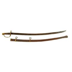 CONFEDERATE CAVALRY SABER. Made by the Confederate States Armory at Kenansville, NC. Nice attic condition example of a popular Confederate sword. 35” blade overall is gray with scattered pitting. CONDITION: Excellent mustard color patina to the hilt and brass mounts on scabbard. Roman numeral XLIII is cut into edge of hilt and top of brass scabbard throat. Grip was carved after leather and wire were removed. Cavalryman who carried it probably did this. Carved grip retains a good patina. Scabbard retains some original paint with large patches of pitting. 8-75977 JS2