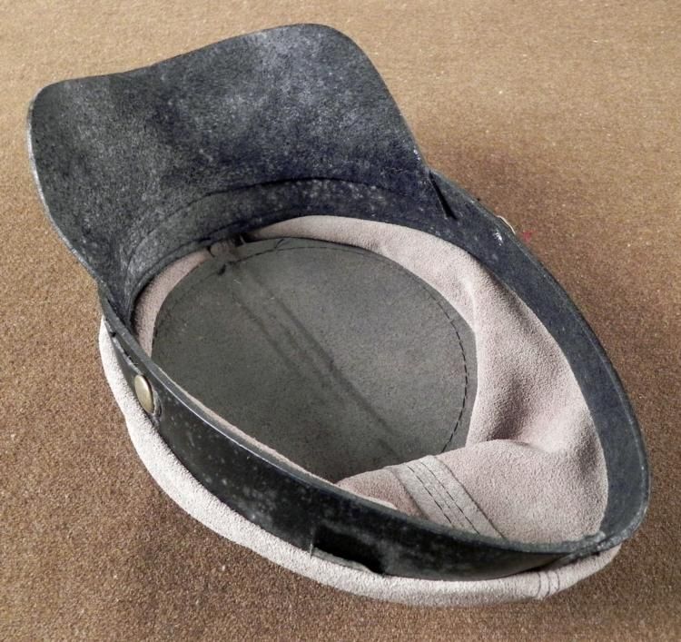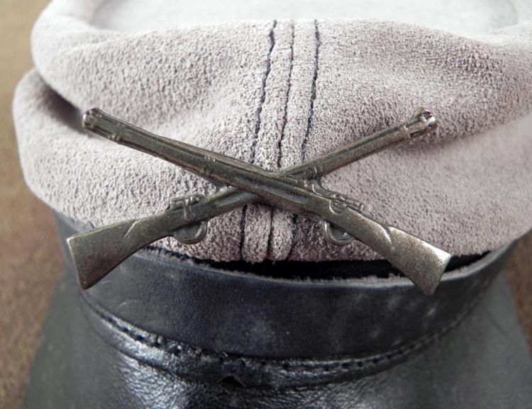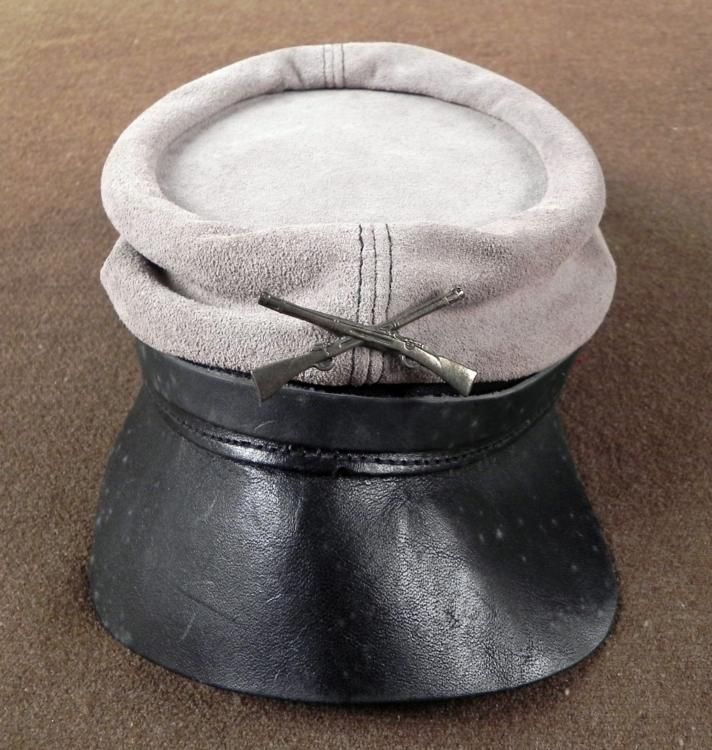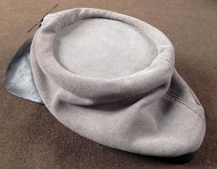 OFFERED HERE IS A VINTAGE, CONFEDERATE CIVIL WAR ENLISTED MAN'S GRAY KEPI HAT, POST-PERIOD. THE INFANTRY EM KEPI CAP IS MADE OUT OF GRAY SUEDE. THE INSIGNIA IS ON THE FRONT OF TWO CROSSED RIFLES. IT HAS A LEATHER BRIM AND CHINSTRAP. *