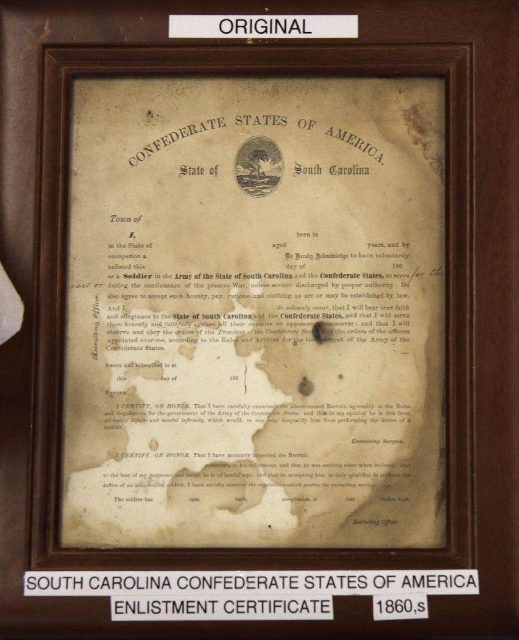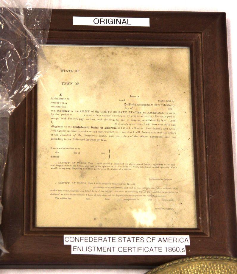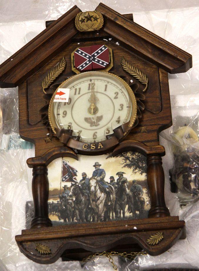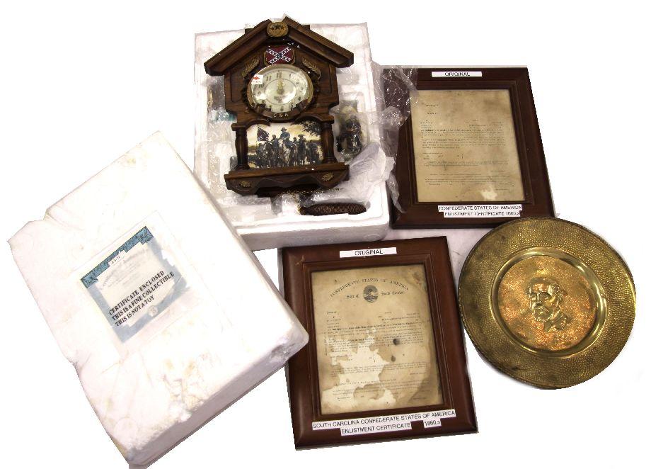 A grouping of Confederate collectibles and decor, including the "Hour of Glory" collectible Rebel cuckoo clock, with COA; a brass Robert E. Lee charger, and a pair of genuine Confederate enlistment certificates in frames.