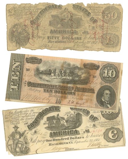 Interesting lot of Confederate paper money and bonds, includes: CSA loan bond for $100.00 with 15 maturity coupons, 13" x 13" mounted, issued on June 13, 1862, boldly signed by Robert Tyler as Register of the Treasury; a CSA $100.00 note printed by Hoyer and Ludwig, Richmond, Virginia depicting slaves loading up a wagon with cotton bales. Issued on Sept. 2, 1861 with a printing of 607,227 of which this bill is No. 1489. Paper is clean on both sides with no ink erosion to the signatures. There is however, one small chip at the lower left hand corner and mounting remnants at the corners on verso; CSA $10.00 note printed by Keating and Allen, Columbia, SC, depicting horses pulling cannons into battle. Issued on Feb. 17, 1864 with a printing of 1,333,239 of which this bill is No. 26007 - Series 3 - Plate A. Details remaining clean, very good with one light fold and a verso stain that has some show through; very scarce CSA $50.00 note issued on Sept. 2, 1861, Richmond, Virginia with very little rag - a tell tale sign that it is not genuine. Our example is war date and countersigned "COUNTERFEIT" three times! Also, A Bank of the State of South Carolina bearer note for 15 cents issued of Feb. 1, 1863. This note is mounted and has a chip that detracts from the signature which disqualifies it from being assigned a grade. Five pieces.