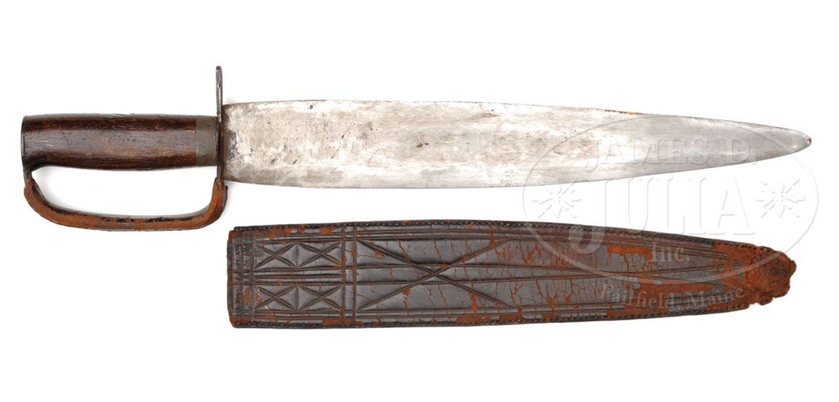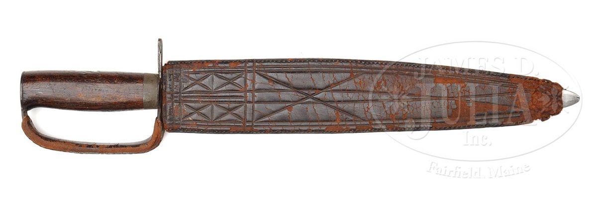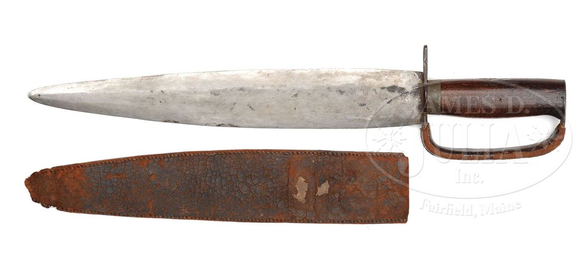 This Confederate Bowie knife, which was a war souvenir brought back with Boyle & Gamble sword previously offered in this catalog, is in "as found" condition. Knife measures about 17" overall with blade just over 12-1/2". Blade is unusually wide and thin for Confederate knives, measuring almost 2" at its widest, with thickest part of blade measuring .14". Spear point blade is extremely sharp on all sides. Wooden grip has pewter ferrule at base, crossguard is iron and knuckle bow is covered with leather and sewn, which is a rare feature that rarely survived, however I am sure other knives originally had this feature. The accompanying orig leather scabbard shows crosshatch design on one side and remnants of old paper tag are found on reverse. Most likely this missing paper tag orig told us the history of this knife. PROVENANCE: Consignor believes that John Burke in the First and Second Michigan Cavalry, both units serving under General George A. Custer in the Civil War, was the soldier who carried knife and sword home as souvenirs. CONDITION: Blade is gray/white overall, showing numerous tool marks which I feel are orig to its manufacture. Wood grip is sound and solid, well fit to ferrule and guard, with one old scraped gouge contemporary to its time of use. Leather scabbard and leather covering knuckle bow are dry, heavily scuffed and scraped; scabbard is missing end and belt attachment. 4-48878 JS11