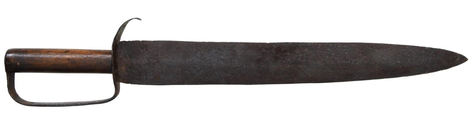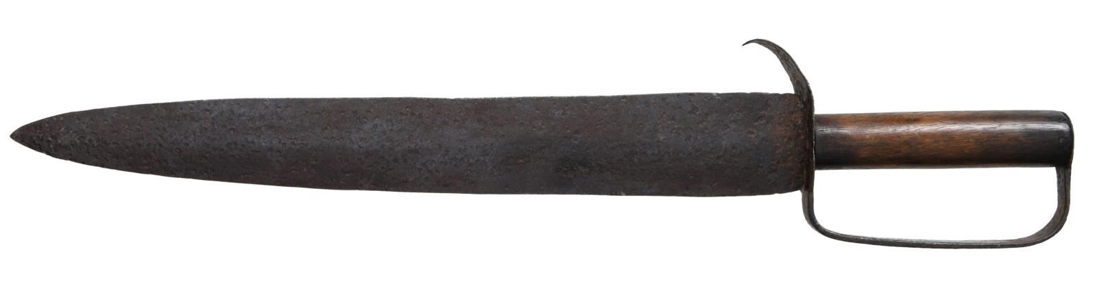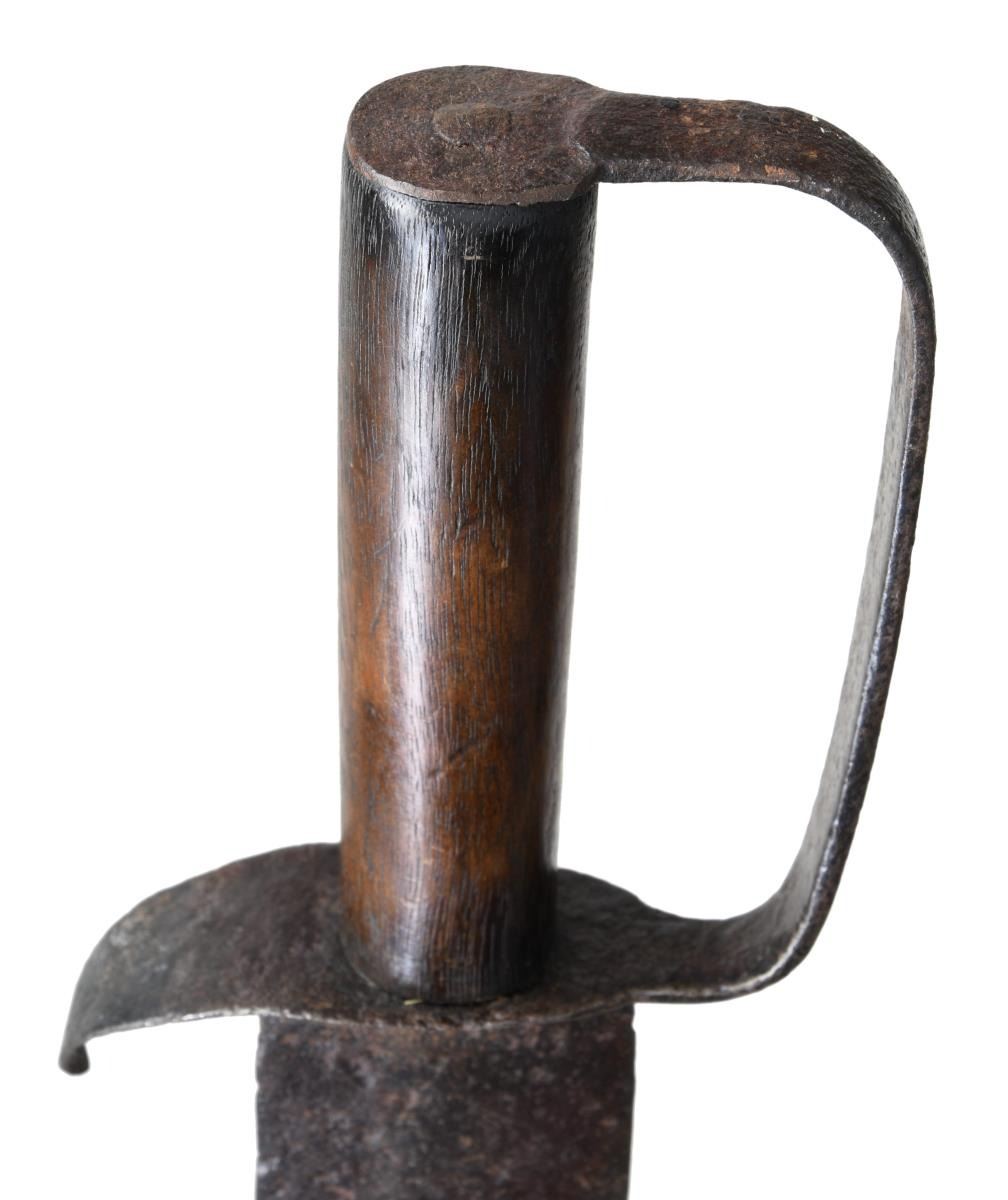 20" overall, 15" double edged, 2" wide blade, turned wood grip. CONDITION: very good overall, blade & guard have heavy pitted iron patina, wood grip is fine showing little wear. (02-19093/JS). $1,500-1,800.
