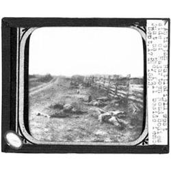 "Lantern slide glass photograph shows Confederate soldiers killed in action at Antietam. Plate identification reads, ""Antietam battlefield west side of Hagerstown road, bodies just as they fell beside fence Sept. 17th 1862"". Interesting view from a series that was quoted as Matthew Brady's effort to bring war to the civilian's doorstep. Near fine." 2412 Lantern slide glass photograph shows Confederate soldiers killed in action at Antietam. Plate identification reads, ""Antietam battlefield west side of Hagerstown road, bodies just as they fell beside fence Sept. 17th 1862"". Interesting view from a series that was quoted as Matthew Brady's effort to bring war to the civilian's doorstep. Near fine.