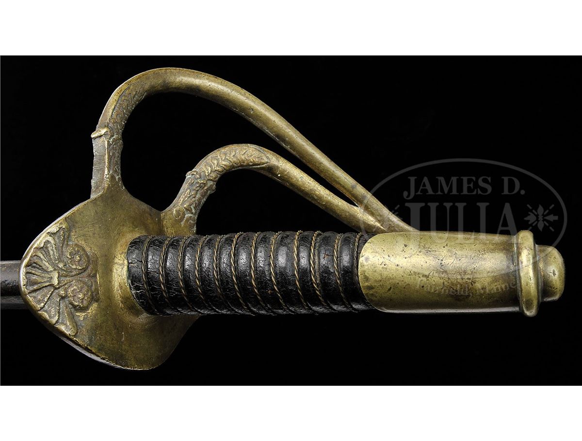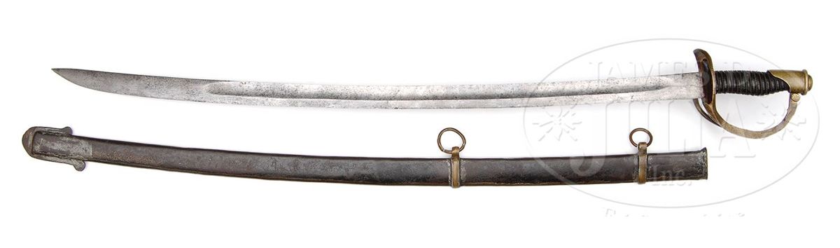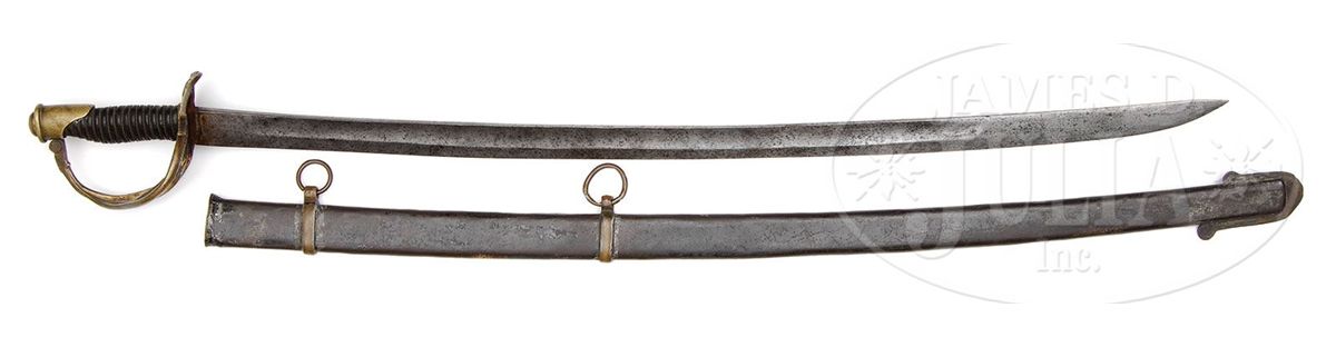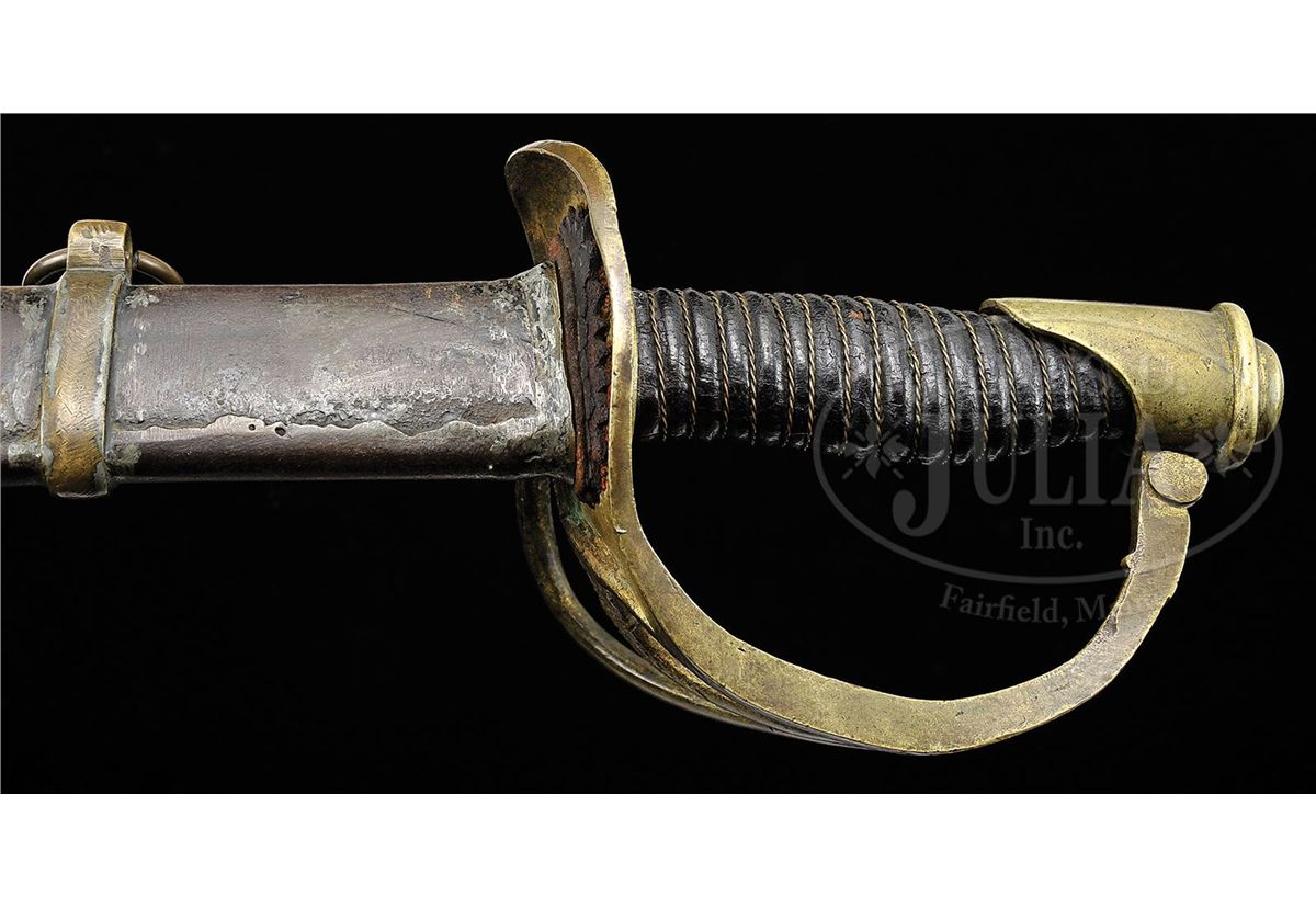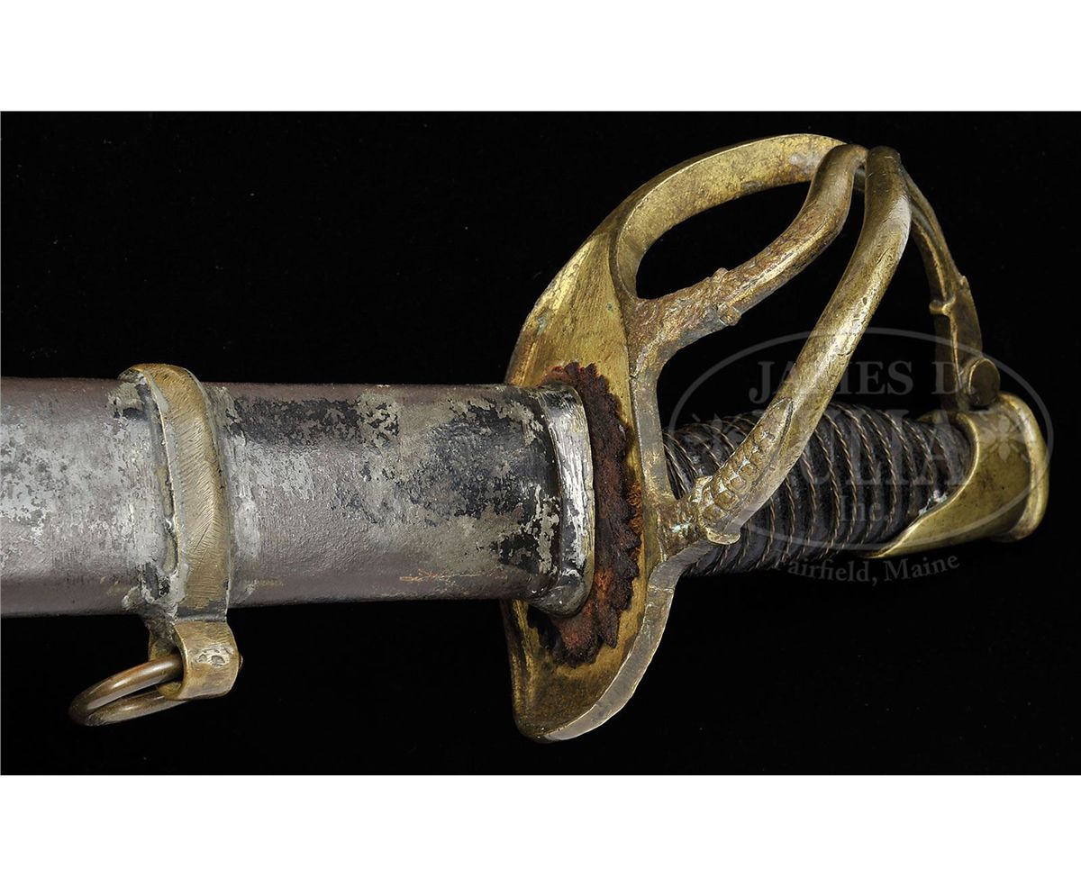 Douglas Cavalry Officer Sabers are among the rarest of all Confederate made swords, and this example is probably the finest example known. This example is 100% orig, authentic and complete in every regard. The Douglas Sword Factory in Columbia, SC was a small Confederate sword maker of high quality arms with only two maker marked examples known. This example we can identify as Douglas through its distinct massive 34" blade with distinctive protective washer composed of a layer of red cloth and saw tooth edge washer. Other distinctive Douglas features are the rondels that decorate the terminus of the knuckle bow into the pommel and at either end of scabbard drag. The gold-plated hilt is decorated with a scalloped floral design at quillon and florally decorated branches. This is a beautiful example of Confederate Cavalry Officer's saber that can probably not be upgraded. PROVENANCE: Steven Hess Collection. CONDITION: 34" unfullered blade is over 1 1/4" wide and 5/16" thick at the ricasso and is gray bright overall with scattered areas of staining and pitting. Leather grip is complete, retaining much of its orig polish and shine, though scuffed, chipped and cracking at high areas. Orig thin twisted brass wire wrapped is tight and complete. Hilt retains strong traces of gold gilt in protected areas, especially on bottom of hilt. Brass overall, where gold is lacking, has good yellow patina. Orig and correct Douglas scabbard has brass throat, ring mounts and rings with correct distinctive Douglas soldered iron drag. Scabbard body overall is sound and solid and smooth with much of it's orig black paint remaining. Orig tool marks are still visible on scabbard body and mounts. Orig 3 layer protective washer is mostly complete and intact with some wear and chipping to surface and edges as can be seen in photos. 8-76361 JS223