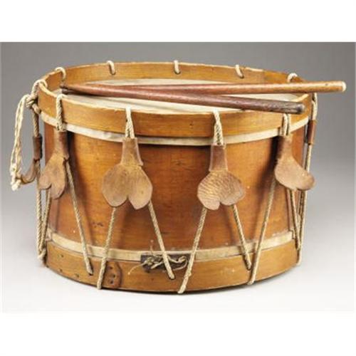 <B>“CONFEDERATE DRUM” ADAIRSVILLE, GEORGIA, WITH PERIOD DRUMSTICKS ca 1860’s </B></I> This is an extremely rare home-made drum with a pencil inscription identifying this drum to Adairsville GA. This drum is 100% original and 100% complete except for two of the leather tensioners which are missing the “ears”.<BR>The drum measures 15 ¼” in diameter and is 9 ¼” in height. The vellum heads are in near perfect condition as is the sinew snare, the cord and the leather “rabbit ears” tensioners. The wooden shell as well as the wooden hoops are fastened together with hand made lead rivets. The 2 maple drum sticks are original to the drum.<BR>This drum was featured in Gary Hendershott’s catalog #119. The accompanying write-up indicates this drum was bought from an Adairsville GA family by a Georgia collector. The family indicated it had belonged to an ancestor and had remained in the family since the Civil War.<BR><BR>The pencil inscription is visible but somewhat difficult to read, but translated as “I received this on January 1, 1863 at Adairsville Georgia”.<BR>Currently in a private Tennessee Collection.<BR><BR><B>Condition:</B></I> Fine-very fine. <BR><BR><b>Shipping:</b> Miscellaneous Collectibles, Larg (<a target="_blank" href="http://www.heritageauctions.com/common/shipping.php">view shipping information</a>)