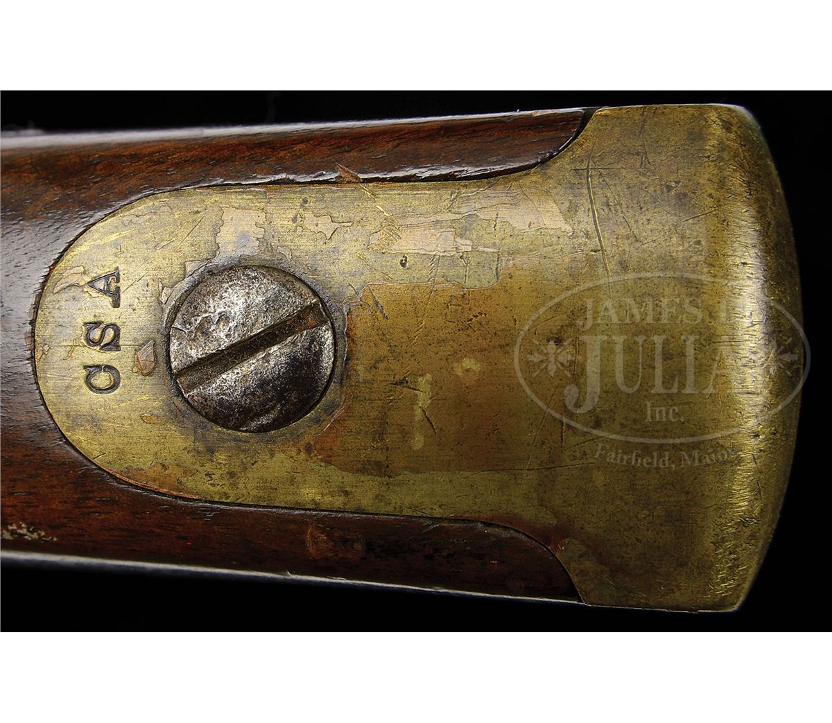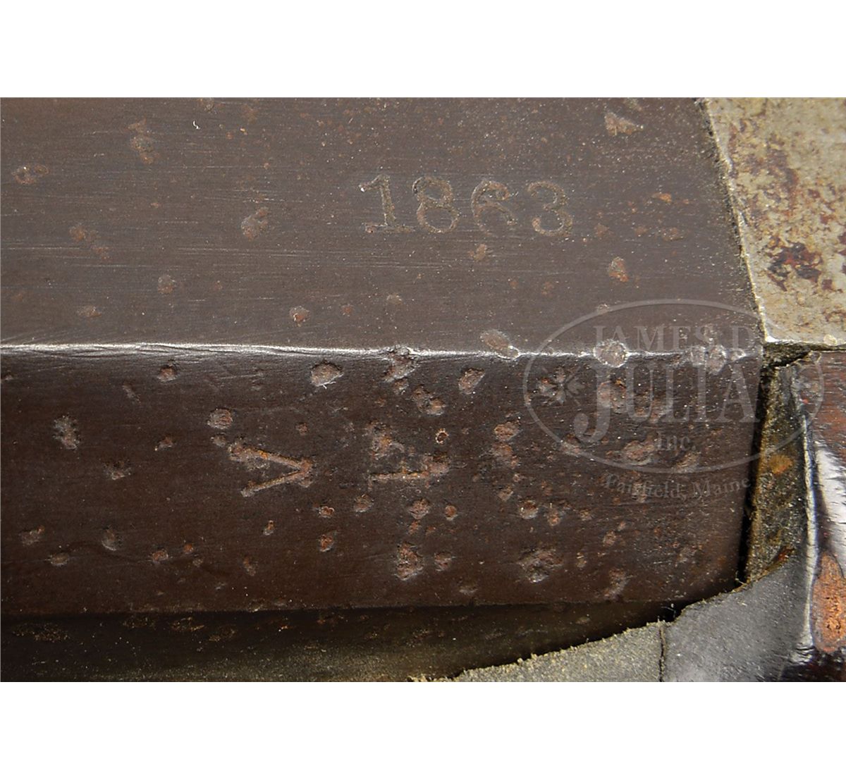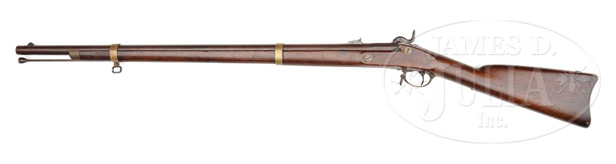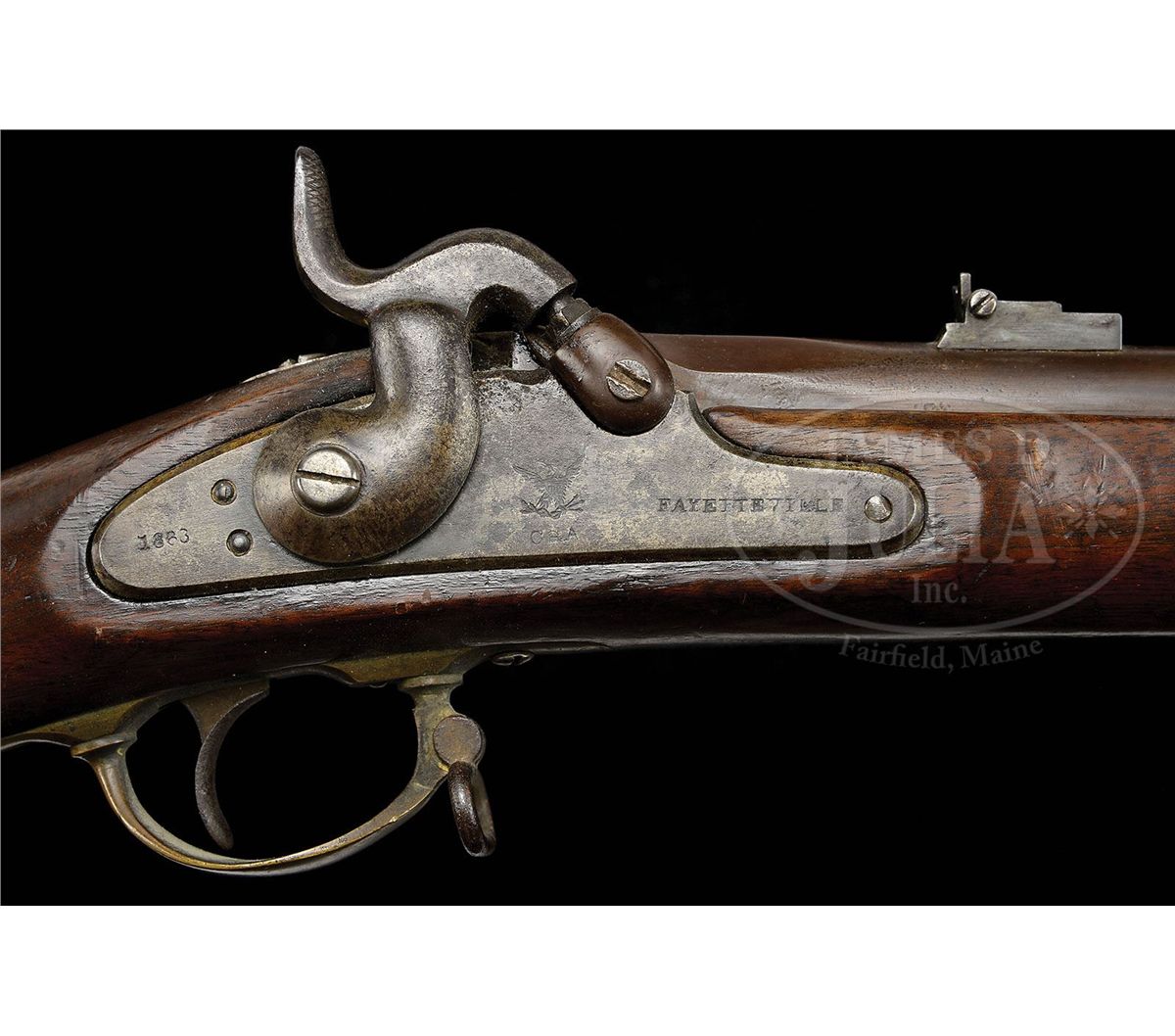 Cal. .58, 33" bbl. This is an early production model Fayetteville Rifle which are found dated 1862 and 1863 with the standard-shaped lock and made to fit a saber bayonet with oval cartouche in stock containing initials of Philip Burkhart. This is an attractive example of an orig scarce Confederate rifle. PROVENANCE: Dr. Andrew Kelley Collection. CONDITION: Bbl is overall brown as refinished. Lock & bbl are both dated "1863" and other appropriate marks are present including inspector's cartouche which is discernible. Remainder of stock is solid & sound with scattered dings, dents & scratches. Front band appears replaced as its color and patina do not match orig rear band. Orig brass nosecap, buttplate, trigger guard and rear band have good matching patinas. Ramrod is reproduction. Gun functions mechanically and rifling in bore is well defined. Stock is sound and solid with scattered dings, dents and scratches. There is an old repair behind bbl on left side where about a 3" sliver of wood is tacked back in place. 4-48861 JS20