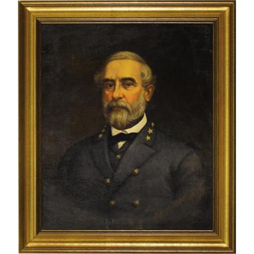 <B>CONFEDERATE GEN. ROBERT E. LEE: AN IMPORTANT SUPERB, LARGE WAR-ERA PORTRAIT</B></I>. Measuring 31” x 35.5” as framed, this imposing oil-on-canvas portrait is attributed to George Drury (1817 - 1894), a well-known portrait artist who long resided in the Nashville area from 1849 until his death. His portrait of Mrs. James K. Polk hangs in the White House. A 1956 letter from Robert T. Quarles, Jr., secretary of the Tennessee Historical Society, confidently attributes the painting to Drury: “At the instance I looked at the portrait my reaction was that it must be a Drury. However, to back my judgment I called his grandson…and made an appointment for you to carry this portrait for him to view. After you left the city, Mr. Carl Drury called me and told me he was convinced in his mind that it was painted by his grandfather.” An additional letter from Carl Drury (included here) also emphatically attributes the painting to his distinguished grandfather. A portrait artist, Drury also painted Jefferson Davis (1862), the Union Commander at the Battle of Nashville Gen. George Thomas, and later Reconstruction governor William G. “Parson” Brownlow, as well as Abraham Lincoln.<BR><BR>The present consignor purchased the painting in 1966 from noted South Carolina antiques dealer Herman Schindler, who had offered it in a display advertisement in <I>Antiques</B></I> magazine. In this ad, Schindler stated that the portrait had “descended in the Lee family, and was purchased for the widow of Robert E. Lee, the grandson of the general, in 1927.” Although no documentation accompanies the painting, this is quite plausible, as history records Col. Lee as having died in 1922. Schindler went on to assert that George Drury was “known to have done sketches of the General, from life, in Tennessee. It is stated that Lee never sat for his portrait. This could be the exception.”<BR><BR>It is certainly highly plausible to assign a War-period date to this work. It depicts a rather youthful, vigorous Lee, in strong contrast to the care-worn images of just a few years later, and of course he is in uniform. The image is a unique one, and certainly does not appear to have been done from any of the widely-known photographic portraits of Lee. As an artwork, the quality is high, and consistent with Drury’s best work. A War-period item in the Nashville <I>Daily Press and Time</B></I> hailed Drury’s works for their “naturalness of expression and color, spirit of look and feature, delicacy of light and shade, preserved as only the real limner can transpose them.” Surely it must rank as one of the finest of Lee period portraits, let alone among those potentially available on the private market.<BR><BR>Overall condition is excellent for display. There is very minor surface craquelure, and the canvas was re-lined long ago. There is possible repair to the upper left corner and strengthening to the left eye, bridge of the nose, and lower center lip. Also a possible repair near the center and surface varnish, all of which occurred long ago and are inconsequential to the display presence of the painting, as the catalog photo shows. An important portrait of one of the towering figures of the Civil War, and a rare acquisition opportunity for sophisticated collectors and institutions alike.<BR><BR><b>Shipping:</b> Framed - without Glass, Large (<a target="_blank" href="http://www.heritageauctions.com/common/shipping.php">view shipping information</a>)