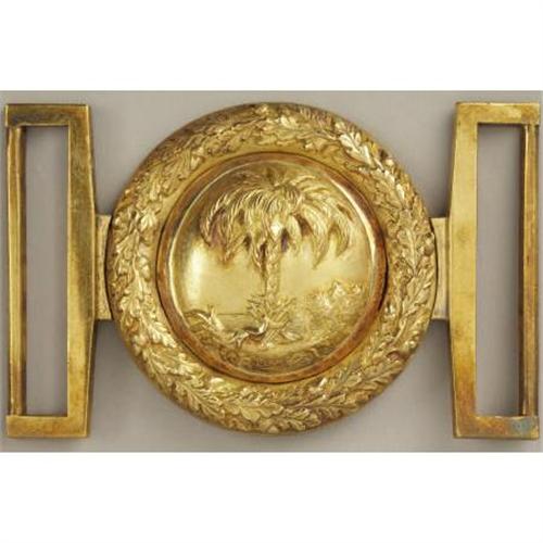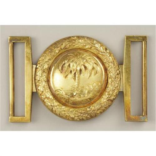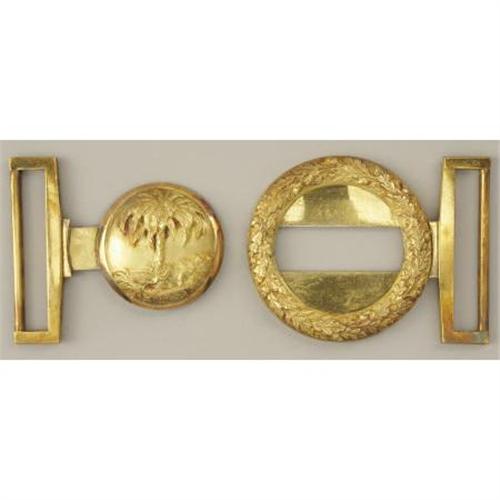<B>CONFEDERATE GENERAL WADE HAMPTON’S JEWELER MADE SOLID GOLD TWO PIECE INTERLOCKING SOUTH CAROLINA WAIST BELT PLATE</B></I> <B>WITH THE ORIGINAL KEEPER AND ADJUSTING BUCKLE.</B></I> The only known "gold Confederate waist belt plate" in existence, believed to have been ordered by Hampton from Hayden & Whilden of Charleston, S. C. on the eve of secession in 1860. This plate was originally acquired from direct lineal descendants of Wade Hampton by noted author/collector William A. Albaugh and is illustrated as Plate #284 on page 193 of O’Donnell’s book. The plate has been professionally tested for gold content and the tongue device and wreath and keeper are 18 karat with the inner bezel being 14 karat. The belt adjustment buckle is gold plated. The keeper and adjusting buckle are decorated with a jeweler finished motif of leaves and acorns. The plate was presumably cast in wax and exquisitely hand finished by a Charleston jeweler under the auspices of Hayden & Whilden. Absolutely unique, exhibiting the highest quality and really without peer. Wade Hampton was born in Charleston, S. C. in 1818 and graduated from South Carolina College in 1836. By 1861 he was the largest land owner in the newly formed Confederate States and at the outbreak of the war organized the famous Hampton’s Legion which he equipped at his own expense and led into battle at First Bull Run, doubtless wearing this buckle. Hampton was severely wounded at Gettysburg and assumed command of the cavalry corps of the Army of northern Virginia after J. E. B. Stuart’s death. By the close of the war Hampton was one of the five highest ranking in the Confederate Army. Absolutely the finest Confederate buckle extant with a superb history of being worn by one of the Confederacy’s highest ranking generals.<BR><BR><B>Condition:</B></I> Just a few tiny hair scratches on the back, obviously the result of it being worn, otherwise absolutely mint and untouched. Really superb.<BR><BR><b>Shipping:</b> Miscellaneous Collectibles, Smal (<a target="_blank" href="http://www.heritageauctions.com/common/shipping.php">view shipping information</a>)