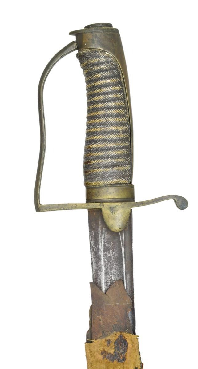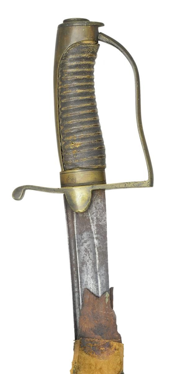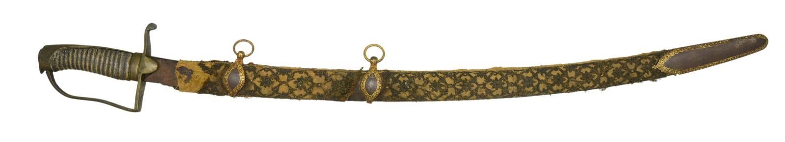 Walter Stevens uniform, sword belt, sash & boots originally came from Confederate collection of Fred Slaton of Nebo, KY. who purchased it directly from a descendent. Well known Confederate uniform collector Bob Walters next on this archive and displayed uniform, accoutrements & this sword for many years until his death. This grouping was recently broken up and his Napoleonic era Damascene English sword is offered here for the 1st time ever by itself. The entire Confederate General Walter Stevens archive was last cataloged and photographed in detail in the Gary Hendershott 2011 Civil War catalog 157 on cover page 1, 2 & 3, priced at a mere $295,000.00. You can buy Gen. Steven’s sword for a mere pittance, as it is being sold unreserved. Rarely do swords identified to Confederate generals with decent provenance and collection history come to market. 31” curved blade is marked “WOOLEY” on the spine who was a well-known 18th & 19th Century British sword maker. The scabbard is most interesting with gold bullion embroidered arabesque design between the iron Damascene mounts. Walter Husted Stevens (1827-1867) was a Confederate States Army brigadier. He graduated from West Point, 4th in his class of 38 in 1848. Even though born in New York, his service took him to Louisiana and Texas for military service. He resigned in March 1861 after Texas seceded. He married the sister of Confederate general Louis Hebert. He was reputed to be the last uniformed man to cross the Mayo Bridge during the evacuation of Richmond on April 2, 1865. After the Civil War, Stevens was appointed superintendent and engineer of the Mexican Imperial Railroad at request of Emperor Maximilian I. He died of yellow fever at Vera Cruz, Mexico, November 12, 1867. Where he would have received a Napoleonic era English sword with Indian colonial decoration is not known, but sure there is an interesting story there. UNATTACHED ACCESSORIES: copy of 2011 catalog and copy of Les Jensen letter of authenticity of the uniform which was the key to the archive. CONDITION: Brass hilt has uncleaned dark mustard/olive patina. Shark skin grip is intact w/ heavy wear. Wood scabbard body is missing throat which would have been iron w/ same gold damascene Arabesque decoration. Fabric is heavily worn w/ worn embroidered bullion decoration w/ 8-pointed stars & Arabesques. Blade is mostly dark gray w/ staining & dark pitting. (02-15166/JS). $2,000-3,000.