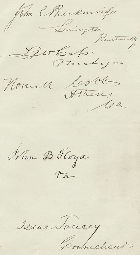 Three signatures of Confederate Generals penned on an 8vo. album sheet: JOHN C. BRECKINRIDGE, HOWELL COBB and JOHN B. FLOYD, along with LEWIS CASS. Fine.