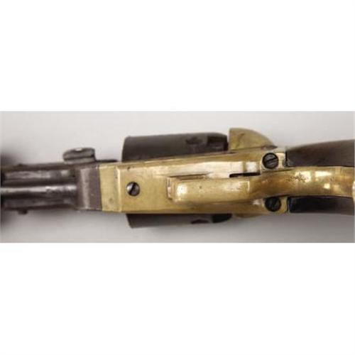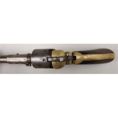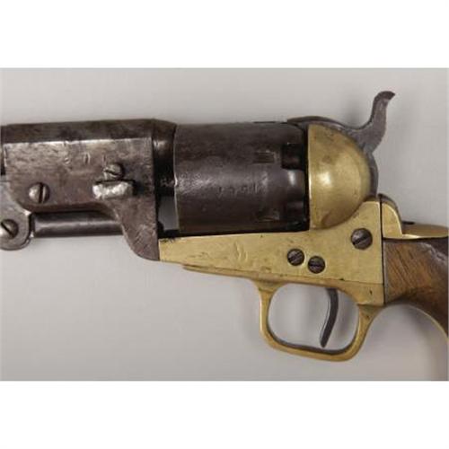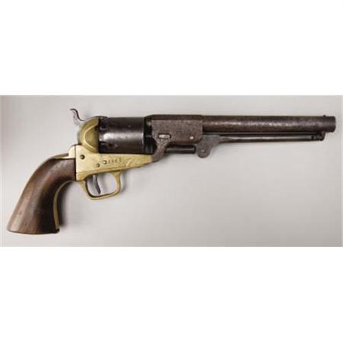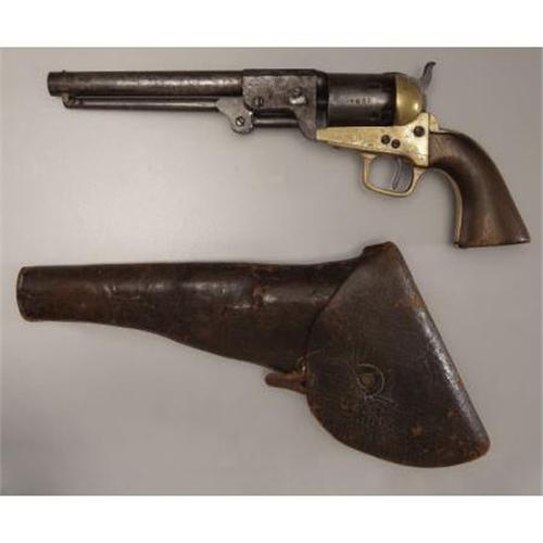 <B>CONFEDERATE GRISWOLD & GUNNISON .36 CALIBER PERCUSSION REVOLVER #1567 MATCHING WITH THE ORIGINAL HOLSTER.</B></I> Before the Civil War, Samuel Griswold began manufacturing operations approximately 9 miles south of Macon GA along the line of the Georgia Central Railroad. The manufacturing facility and a cluster of homes became Griswoldville. With the coming of the war in 1861, Samuel Griswold shifted the cotton gin factory to the production of pikes for the government. In the summer of 1862, he was joined by Arvin Gunnison who had started a revolver making enterprise in New Orleans and had escaped that city just prior to its capture. Soon thereafter, revolver production began at Griswoldville. <BR><BR>The .36 caliber, percussion revolver was made in 2 patterns -- the First Model featured a round barrel housing and the Second Model, an octagonal barrel housing. The basic pattern followed the Colt Navy Model 1851 with 2 distinct differences - a brass frame and a round barrel. The Second Model was introduced around serial number 1500. Total production of both models was between 3600 and 3700 completed and delivered, making this enterprise the largest revolver producer in the Confederacy. Revolver production was interrupted in November 1864 with the destruction of the factory by Union forces.<BR>Production was re-started on a limited scale and continued until April 1865. <BR><BR>This revolver, serial number 1567, is one of the earliest surviving examples of the Second Model and based on the serial number was made in the late summer of 1863.<BR><BR>The serial number is found on the right side of the frame, right side of barrel assembly and on the cylinder. The secondary number is “7” and is found on the loading lever, inside of trigger guard, bottom of wedge and on the hammer. Cryptic “Y” is found on the bottom of the barrel near the loading lever catch and on the rear of the right frame. Roman numeral “VII” is found on the inside flat of the trigger guard and the backstrap.<BR><BR>This revolver is original and complete and is in overall very good condition.<BR><BR>The brown leather holster is also in very good condition and remains pliable. The outline of the revolver is pressed into the leather indicating its long storage. The pattern follows the standard for U. S. contract suppliers. The belt loop is present and is secured by 3 brass (or bronze) rivets. The brass finial is present as is the leather closure loop which is secured by a single brass rivet.<BR><B><BR>Condition</B></I>:<BR><BR><B>Revolver</B></I> - Overall condition is very good with an even dark patina on the iron parts with light pitting on the barrel and cylinder likely from long storage in the holster. The brass is of an even, pleasing, yellow patina. The walnut grips which have shrunk, are in nearly perfect condition. The revolver retains sharp edges and its overall condition indicates limited use. <BR><BR><B>Holster:</B></I> Complete and original with some wear but no holes or tears. <BR><BR><B>Provenance:</B></I> Turned up by Bill Carr in 1958 who purchased it from a Mrs. Webster, Ottawa Street, Pontiac MI. Noted author, Mr. Wiley Sword, purchased this revolver in 1958 and it remained in his collection until 1999 when it was sold at auction. According to Mr. Sword, Mr. Carr had told him that Mrs. Webster’s grandfather, a Union soldier, brought the revolver and holster home from the war.<BR><BR>From 1999 - 2004, this revolver and holster were in a private Chicago collection. From 2004 until now, they were in a private Tennessee collection.<BR><BR><B>Other:</B></I> Accompanied by a copy Mr. Sword’s very first published article in “The Gun Report”, March 1959, which is about Griswold and Gunnison ( which he referred to as “Griswold and Greer” ) and this revolver. Also pictured in “Firepower From Abroad”, pg. 106. Also included is a copy of the 1999 James D. Julia auction catalog featuring the Wiley Sword Collection and other material from Mr. Sword about the revolver and holster, including a 3-ring binder put together by Mr. Sword for the 1999 auction. <BR><BR><b>Shipping:</b> Requires 3rd Party Shipping (<a target="_blank" href="http://www.heritageauctions.com/common/shipping.php">view shipping information</a>)