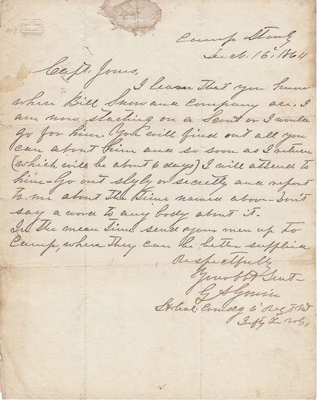 Superb-content A.L.S. by Lt. Col. G. A. Gowin of the 6th Tenn. Mounted Infantry, 1p. 4to., "Camp Stanley" Dec. 16, 1864 to Capt. Jones concerning the whereabouts of the Confederate guerrilla, Capt. Bill Snow: "I learn that you know where Bill Snow and company are. I am now starting on a Scout or I would go for him. You will find out all you can about him and so soon as I return (which will be about 6 days) I will attend to him - Go out slyly or secretly and report to me about the time named above - Don't say a word to any body about it. In the mean time send your men up to Camp, where they can be better supplied." William Snow (1809 -1876) was born in North Carolina and settled in Tennessee in the 1830s. At the start of the war, he was captain of Co. B of Brazelton's Cavarly. After a year, he resigned his commission, returned to Hamilton County and organized Snow's Scouts with his two sons, operating out of his three story brick home on his plantation at Snow Hill. In late 1864, Union forces hauled cannon from Chattanooga to bombard the house, but were unable to drive out its defenders. The 6th Tennessee Mounted Infantry was organized in October 1864 in Chattanooga and acted as scouts in the Cumberland Mountains in Tennessee and northern Georgia, in pursuit of the numerous guerilla bands that operated in that vicinity. Usual folds, else very good.