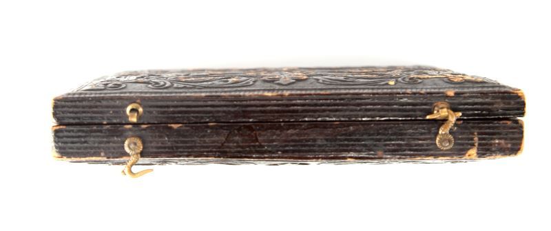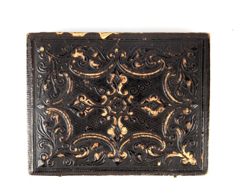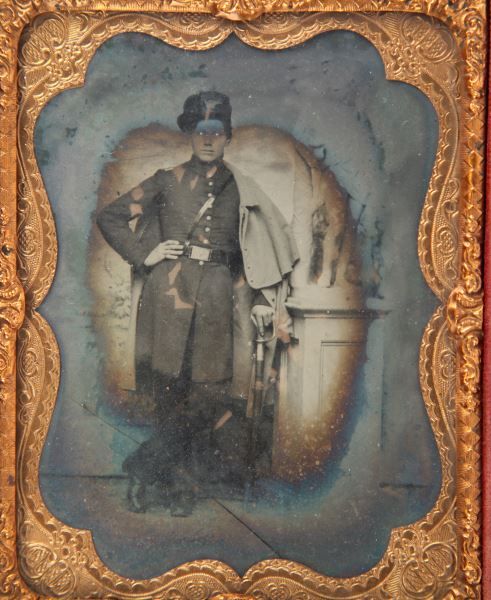 Quarter plate of a Confederate Infantry soldier leaning against his sword and a pillar statue on it. He has Infantry bugle cap device a square belt buckle and what appears to be a Confederate foot soldier sword. Overall in good condition.