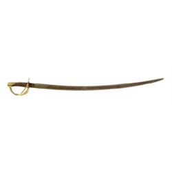 CONFEDERATE MCELROY ENLISTED CAVALRY SABER. 35-1/2" blade. 41" overall. Excellent example of the rarely found maker marked McElroy saber. "W.J. MCELROY, GA." is cast into pommel cap. Inspector marks “RMC” are stamped in the underside of the guard, presumably the initials of Richard M. Cuyler, the superintendent of the Macon Arsenal. These inspector’s marks are found only on McElroy cavalry sabers and bronze cannons from the Macon Arsenal, and McElroy is known to have sold Sabers directly to the Macon Arsenal. Stopped fullered blade with typical long taper to point. Grip is carved wood with large single copper wire. Grip appears to never have had a leather wrap, only polished wood. Brass grip and pommel are cleaned. There are probably fewer than 10 marked examples of this sword. CONDITION: About 1/2" blade tip broken. Shows old sharpening, scattered pitting. 4-53357 JS3