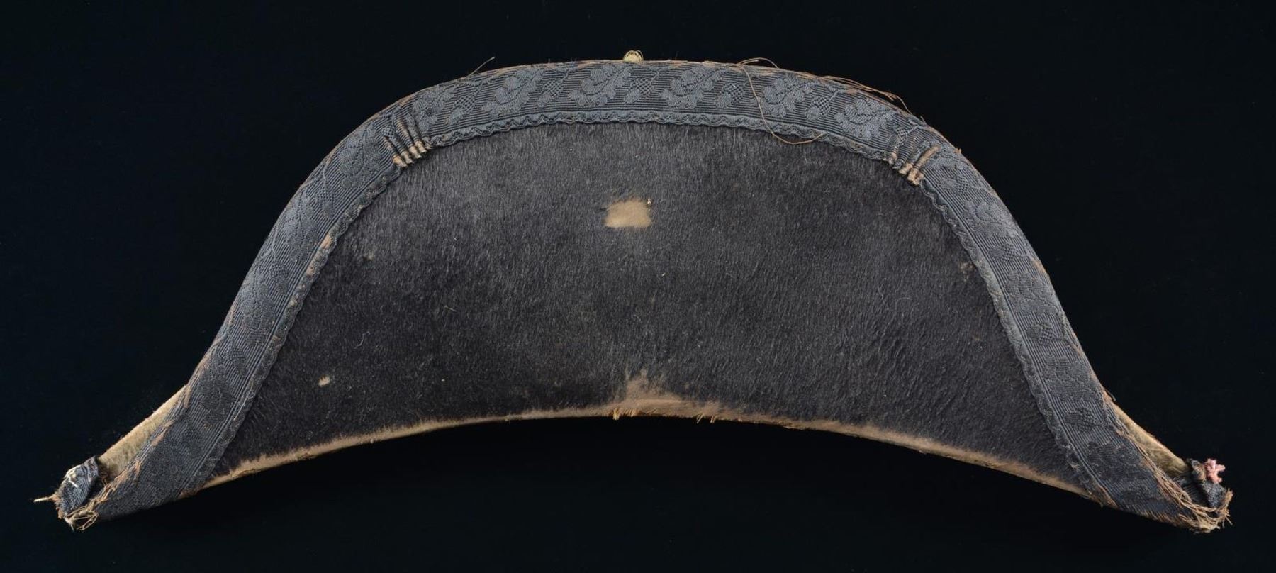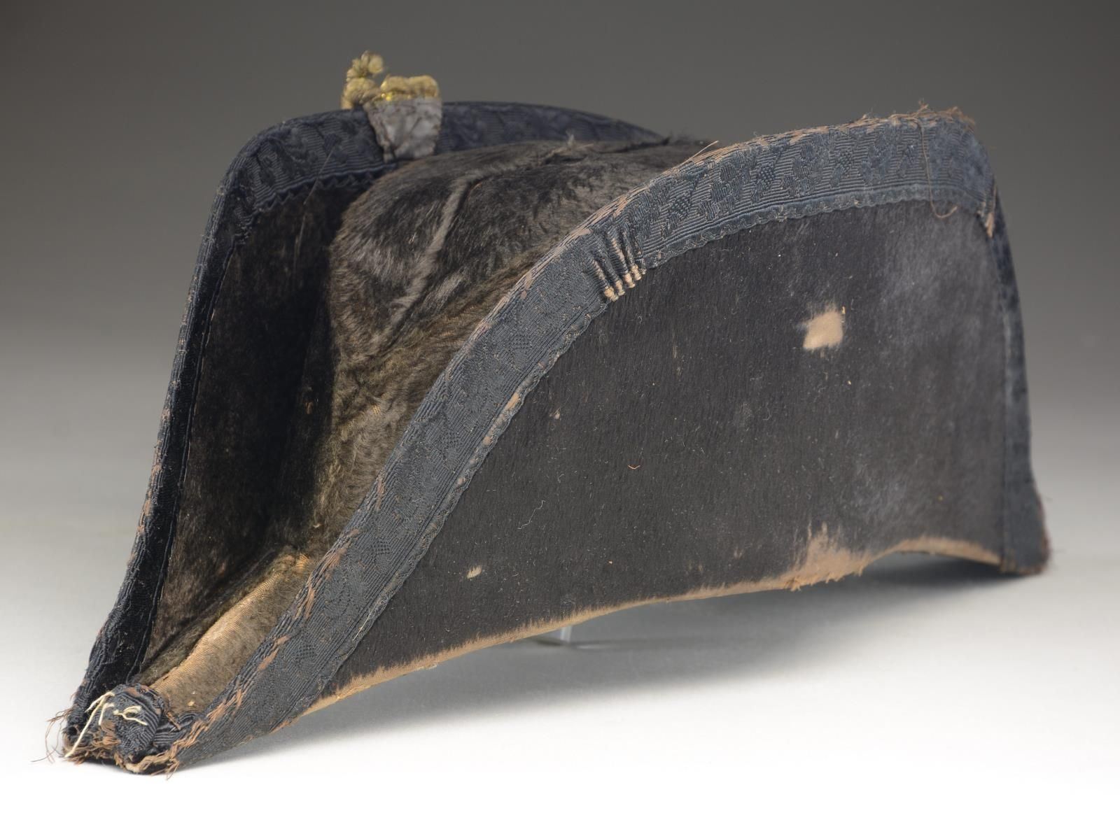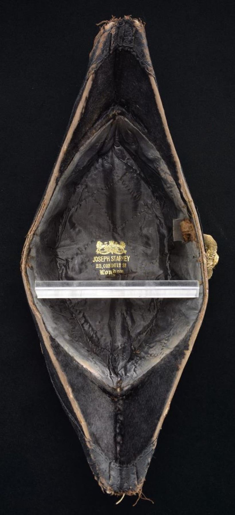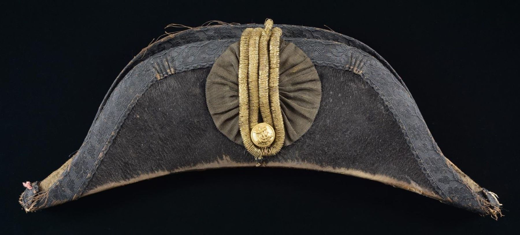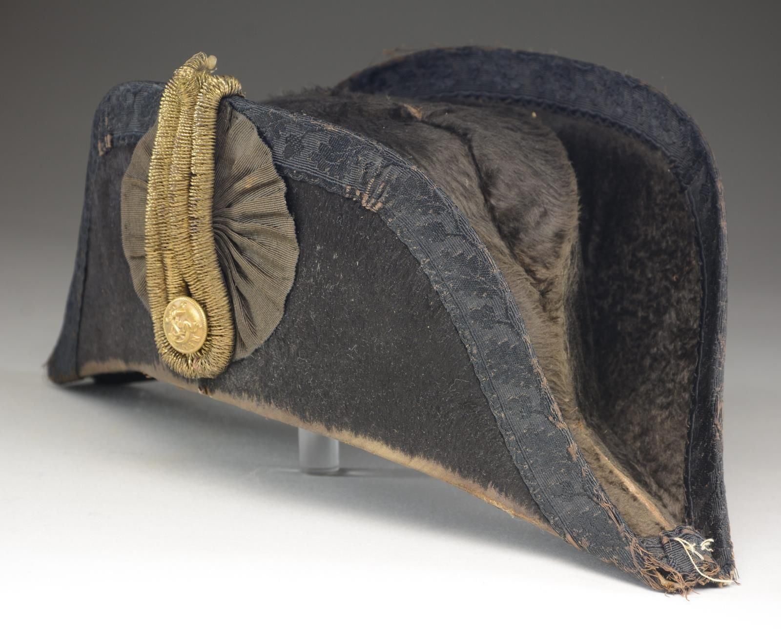 CAMPBELL BUTTON. An interesting period chapeau by Starkey of London. The Confederate States Naval Regulations do not call for a chapeau as part of the official uniform; however, chapeaus were popular with Naval officers and were regulation for the Union Navy. It is quite easy to imagine a Confederate Naval officer having a private purchase chapeau in his sea chest. This chapeau is fine beaver with a black grosgrain cockade on the side. In front of the cockade are four rows of gold bullion with a coat-size Confederate States Navy button. The button is backmarked “S. ISSACS CAMPBELL & CO LONDON 71 JERMYN. ST”. The interior of the chapeau has a silk lining with a British crest above the words “JOSEPH STARKEY 23, CONDUIT ST London”. Starkey was a prolific supplier of naval uniforms to the US Navy. He is also known to have produced uniforms for the Confederacy, and his retailer backmark is known on Confederate Navy buttons. CONDITION: the chapeau does show moderate wear throughout, with some loss of knap on the beaver. The bullion is a bit loose at the top, and the button retains its substantial original gilded finish with no damage. The interior markings are clear. (02-21301/BF). $700-1,000.