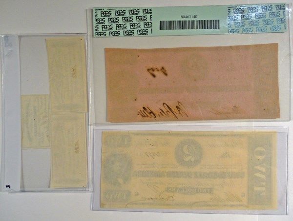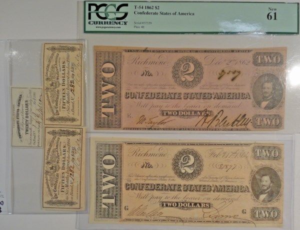 CONFEDERATE NOTES: 2-$15.00, 1-$20.00 BEARER NOTES: 1864 $2.00 XF, 1864 $2.00