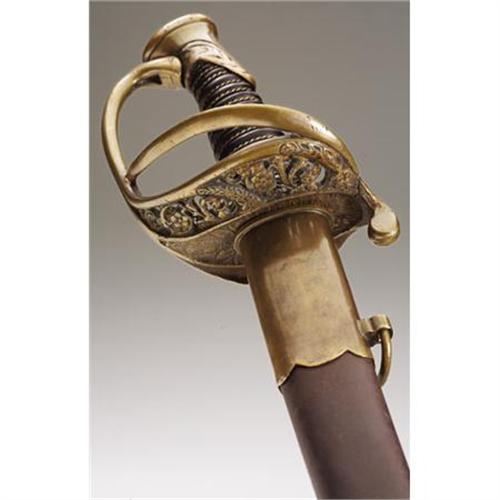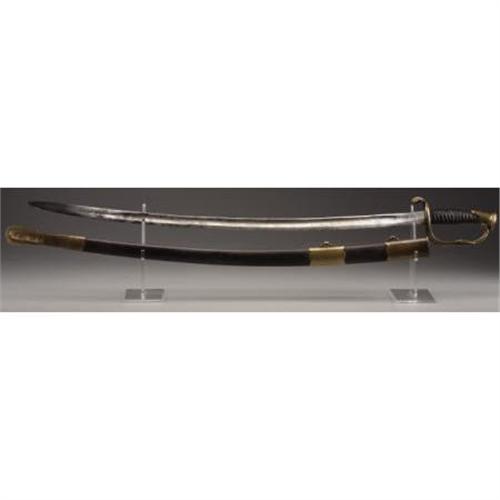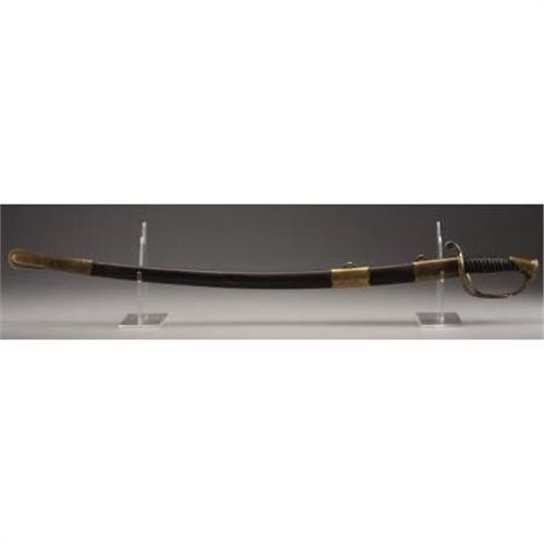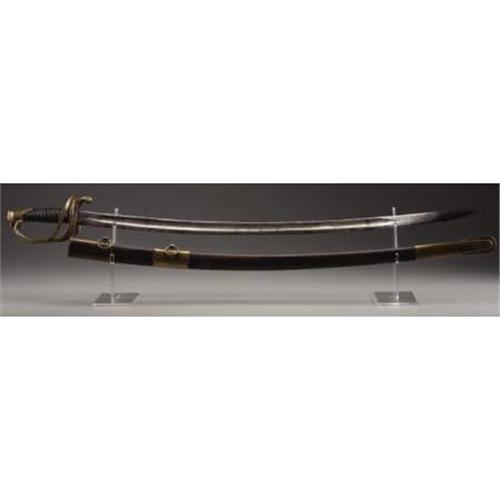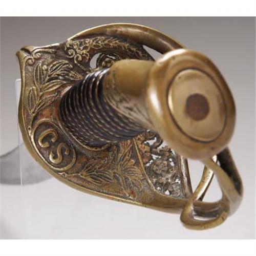 <B>RARE CONFEDERATE LEECH & RIGDON ‘EXTRA BRANCH’ STAFF AND FIELD OFFICER’S SWORD AND SCABBARD</B></I>. Definitely one of the rarest of the Leech & Rigdon patterns with only a handful known, this being and exceptional specimen. Thomas Leech and Charles Rigdon formed the Memphis Novelty works in 1861 and by May 1862 had moved to Columbus, Mississippi. Although better known for their navy pattern revolvers they were also prolific producers of edged weapons. The firm was dissolved in December of 1863. The brass hilt uses a single outward branch that curls around to the back of the knuckle bow. The half basket is cast with pierced floral designs. The inboard side of the guard , on the top, has a large “CS” inside of an oval with sprigs of leaves and berries on either side, all integrally cast. The pommel cap is rather crudely cast with laurel leaves. The grip is polished wood with twisted brass wire wrap. The knuckle bow is slotted for a sword knot. The underside of the guard is cast with a leaf like decoration radiating from the blade. The sword retains the original thin leather washer. The 30 ¼” deeply curved blade has an unstopped fuller which terminates 6” from the tip and 1” from the guard. The blade is etched for 2/3 of its length with floral/scroll decoration and a fancy script “CSA” in the center of the reverse. The original iron scabbard has unengraved mounts with scalloped edges and brass carrying rings. The flat brass throat is brazed to the top mount. A rare Confederate sword with graphically striking Confederate motifs in wonderful condition.<BR><BR><B>CONDITION: </B></I>Brass hilt with nice medium patina, grip and wire excellent with just a few tiny chips at the base of the grip. The blade has some scattered patches of light pitting, the balance a light gray. The etching shows wear but is very good. The iron scabbard is dark and untouched. Brass mounts also with medium patina, just a few tiny wrinkles on the bottom mount, otherwise perfect. Overall really very nice and correct and original in every respect.<BR><BR><B>Provenance:</B></I> <I>The Tharpe Collection Of American Military History</B></I><BR><BR><B>Exhibited:</B></I> <I>The Liberty Heritage Society Museum</B></I><BR><BR><BR><b>Shipping:</b> Requires 3rd Party Shipping (<a target="_blank" href="http://www.heritageauctions.com/common/shipping.php">view shipping information</a>)