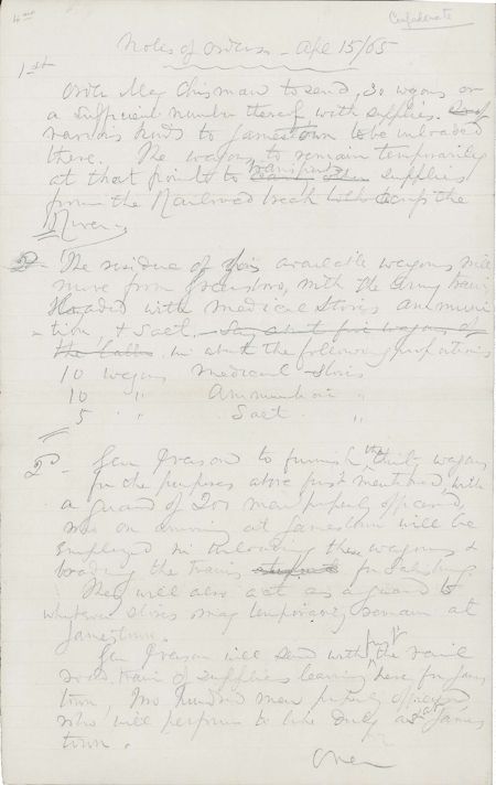 Fine content war-date A.D. (unsigned), 2pp. legal folio, [near Appomattox], Apr. 15, 1865, in pencil, written six days after Lee's surrender and four days after his farewell to his troops. The document, headed "Notes on Orders", shows Confederate logistics in the wake of the surrender. In small part: "...Order Maj. [Samuel R.] Chisman to send 30 wagons or a sufficient number thereof, with supplies...the residue of the available wagons will move from Jonesboro, with the Army train, loaded with medicine, stores, ammunition & salt...Gen. [Alfred] Iverson to furnish the thirty wagons for the purposes above...with a guard of 200 men properly officered and on arriving at Jamestown will be properly employed unloading the wagons & boarding the trains for Salisbury...Inform Col. Clarke...that Gen. Ferguson reports that nothing has been done both [?] of RR & telegraph at Salisbury...". Very good.