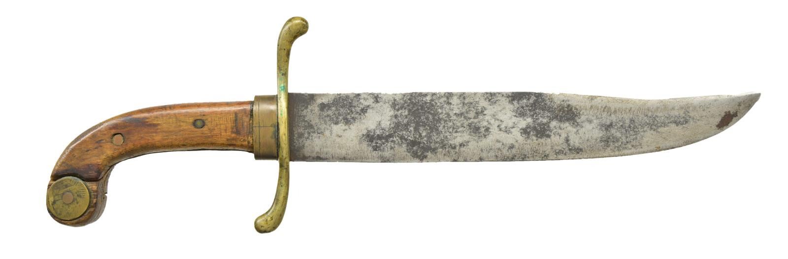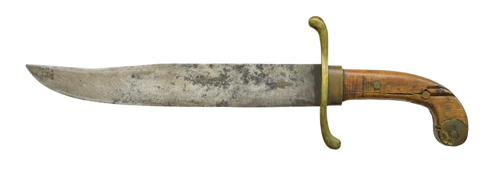 16" overall, 10.75" clip point. This is an interesting knife showing filing like seen on so many Southern bowies. 5" brass "S" shaped crossguard and welded full tang are not typical features of Confederate knives known, but sure appears of the period and Confederate ingenuity always surprises. CONDITION: good-very good overall, blade is still sharp including 4" clip, wood slab grips have break on either side but retained by the large brass washers at butt. (02-19309/JS). $600-800.