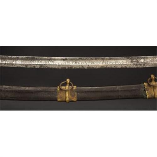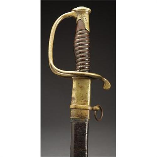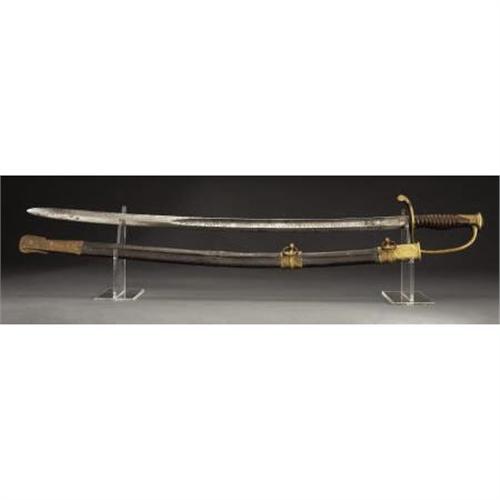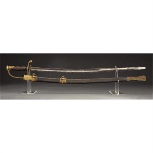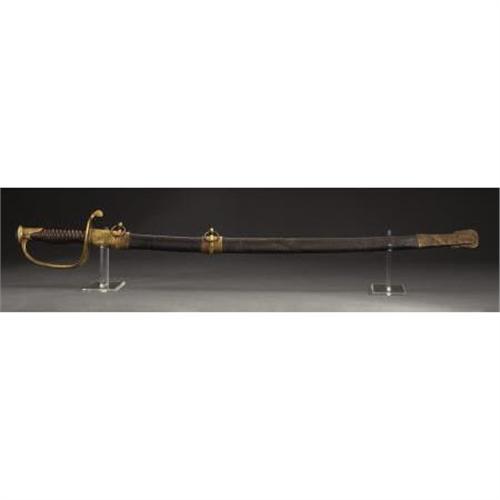 <B>CAPT. MAGNERTH CHATTAHOOCHEE VOLUNTEERS CONFEDERATE PRESENTATION FOOT OFFICER'S SWORD WITH ORIGINAL LEATHER SCABBARD, BY W. J. McELROY OF MACON, GA.</B></I> W. J. McElroy presentation staff officer's sword; blade presentation in English script: "Capt. Magnerth<I> </B></I>Chattahoochee Volunteers"<BR><BR>William J. McElroy, a most noted manufacturer of Confederate equipment, began sword making as the winds of war began to blow and operated throughout the Civil War. In addition to the production of all types of swords and sabers, he produced a varied range of other products, including bayonets and bowie knives of all types, belts, buckles, spurs, and canteens. McElroy was also the manufacturer of pikes for the State of Georgia. He was a prolific and noted producer of military supplies to the Confederate Government, the State of Georgia and private individuals.<BR><BR>This beautiful presentation sword was presented to Capt. Magnerth by the Chattahoochee Volunteers, which is etched in the presentation panel on the left side of the blade. The blade has etching on both sides this sword that is clear and distinctive. The right side of the blade is etched beginning above the ricasso is a panel with the firm name and address in script, “W. J. McElroy/ Macon, Geo.;” above that is a wreath over a cannon, above which is a halberd and a Confederate First National flag with a spear pointed staff; on the left the Confederate Battle flag; above that is a plaque is “CS” in block with serifs on the letters; the remainder of this side of the blade to within 11” of the tip is etched with laurel vines with leaves. The left side of the blade is etched to within 11 ½” of the tip; beginning above the ricasso is the presentation panel in old English scrip, “Capt. Magnerth * Chattahoochee Volunteers.” The blade is 29 1/4 “ from ricasso to tip, the total length of the blade along with hilt is 35 ¼." The sword is tight to the hilt with no washer; the blade has been cleaned and has some rust/pitting.<BR><BR><B>Provenance:</B></I> <I>Headley Collection</B></I><BR><BR><B>Condition: </B></I>The guard has a beautiful patina with none of its original gold gilt remaining; the guard has a single extra branch with a small branch connecting. The pommel is cast with laurel vines. The polished wood grip is cracked with a small chip at the pommel and at the bottom; the wire wrap is missing. The leather scabbard retains its original color; there appears to be a repair between the middle mount and the drag. The scabbard is topstitched with no openings. The mounts are typical of those of McElroy and are held in place with rivets. This is an opportunity to add to your collection one of the most beautiful, well preserved and historical Confederate presentation swords known to exist from the noted manufacturer, W. J. McElroy of Macon, Georgia.<BR><BR><b>Shipping:</b> Requires 3rd Party Shipping (<a target="_blank" href="http://www.heritageauctions.com/common/shipping.php">view shipping information</a>)