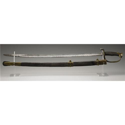 <B>CONFEDERATE PRESENTATION FOOT OFFICER'S SWORD WITH ORIGINAL LEATHER SCABBARD by W. J. McElroy of Macon, Georgia</B></I> This is a W. J. McElroy presentation staff officer's sword; blade presentation in English script:<BR><BR><I>L. L. Strozer</B></I><BR><BR>Captain L. L. Strozer served in the 25th Georgia Provost Guards, a 1,000-man unit organized to round up deserters.<BR><BR>This sword has its original black leather scabbard with topstitching. The stitching has been re-glued. The mounts retain some of its original gold gild, and the ring on the top mount is original. The middle ring mount appears to be a period replacement. The overall condition of the scabbard is good, dry but stable with cracking and checking. This sword was carried by L. L. Strozer, whose name is etched in the panel on the left side of the blade. Also on this side of the blade is etched a stand of two flags; the etching extends from the ricasso to within 12” of point. The opposite side of the blade is etched with a floral pattern, “CS” in the middle of the blade and a panel near the ricasso with the firm name, “W. J. McElroy, Macon, Geo." The blade is 28 3/4" from ricasso to tip. Overall, the blade along with hilt is 34½.”<BR><BR>The guard has beautiful “attic find” patina with little of the original gilt. The top and bottom of the guard are beautifully engraved with an unique oak leaf pattern. The sword's original black leather grip with twisted copper wire is in excellent condition.<BR><BR><B>Provenance:</B></I> <I>The Headley Collection</B></I><BR><BR><b>Shipping:</b> Bats, Clubs, Sticks, Swords, Rif (<a target="_blank" href="http://www.heritageauctions.com/common/shipping.php">view shipping information</a>)