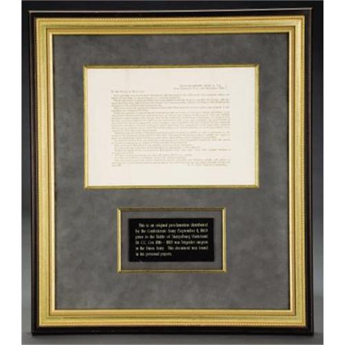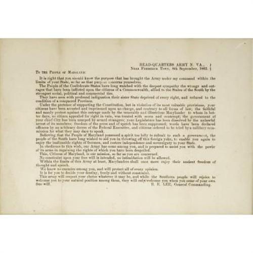 <B>CONFEDERATE PROCLAMATION BY “R.E. LEE” HEADQUARTERS ARMY N. VA. 1862</B></I> This is an original proclamation distributed by the Confederate Army, near Frederick Town, 8, September, 1862. Prior to the battle of Sharpsburg (Antietam). Dr. C. C. Cox was brigadier surgeon in the Union Army. This document was found in his personal papers. <I>n part <BR><I>“To the people of Maryland: It is right that you should know the purpose that has brought the Army under my command within the limits of your state, so far as that purpose concerns yourselves. The people of the Confederate States have long watched with the deepest sympathy the wrongs and outrages that been inflicted upon the citizens of a Commonwealth, allied to the States of the South by the strongest social, political and commercial ties. They have seen with profound indignation their sister state deprived of every right, and refused to the condition of a conquered Province….believing that the people of Maryland possessed a sprit too lofty to submit to such a government, the people of the South have long wished to aid you in throwing off this foreign yoke, to enable you again to enjoy the inalienable rights of freemen, and restore independence and sovereignty to your State… This Army will respect your choice whatever it may be, and while the Southern people will rejoice to welcome you to your natural position among them, they will only welcome you when you come of your own free will. R. E. Lee, General Commanding.”</B></I> Very RARE item from the Confederate States of America. Measures approximately 10.5” x 7.5” , mounted in frame 16” x 18”. <BR><BR><B>Condition:</B></I> Fine - very fine, light folds.<BR><BR><b>Shipping:</b> Framed - without Glass, Small (<a target="_blank" href="http://www.heritageauctions.com/common/shipping.php">view shipping information</a>)