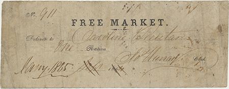 War-date partly-printed D.S. 1p. oblong 12mo., [n.p], Jan. 1865, titled "Free Market" and delivering "one Ration" to Caroline Reutar, presumably the widow of a fallen CSA soldier. On verso is a list of dates upon which Caroline received rations beginning with Sept. 10, 1864. Light wear and soiling consistent with age and quality of paper, otherwise very good.