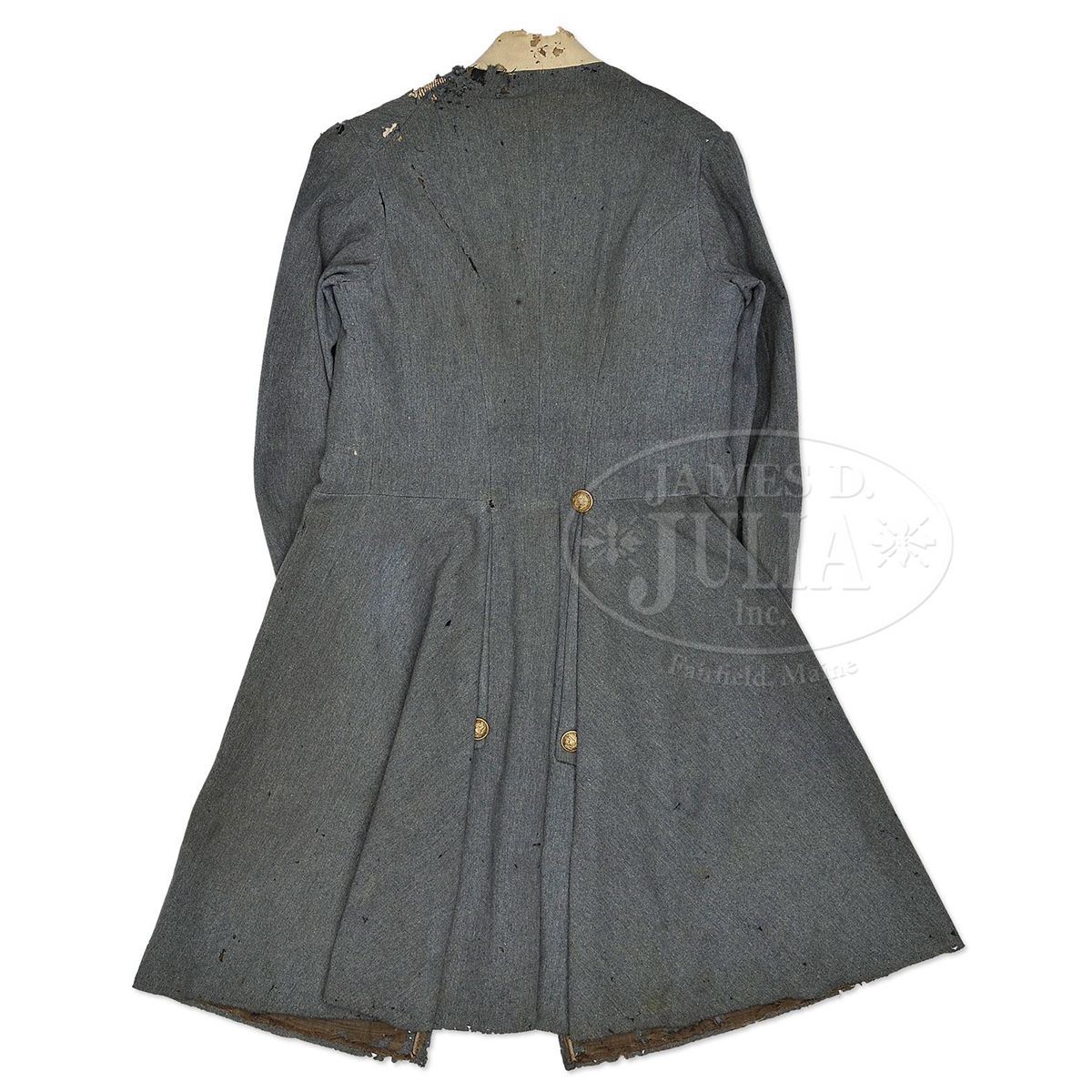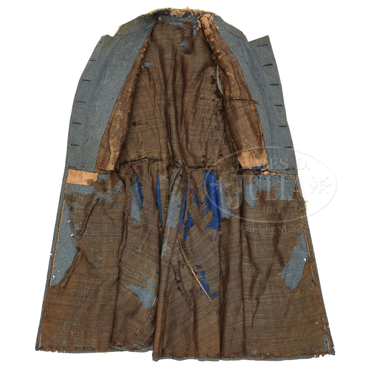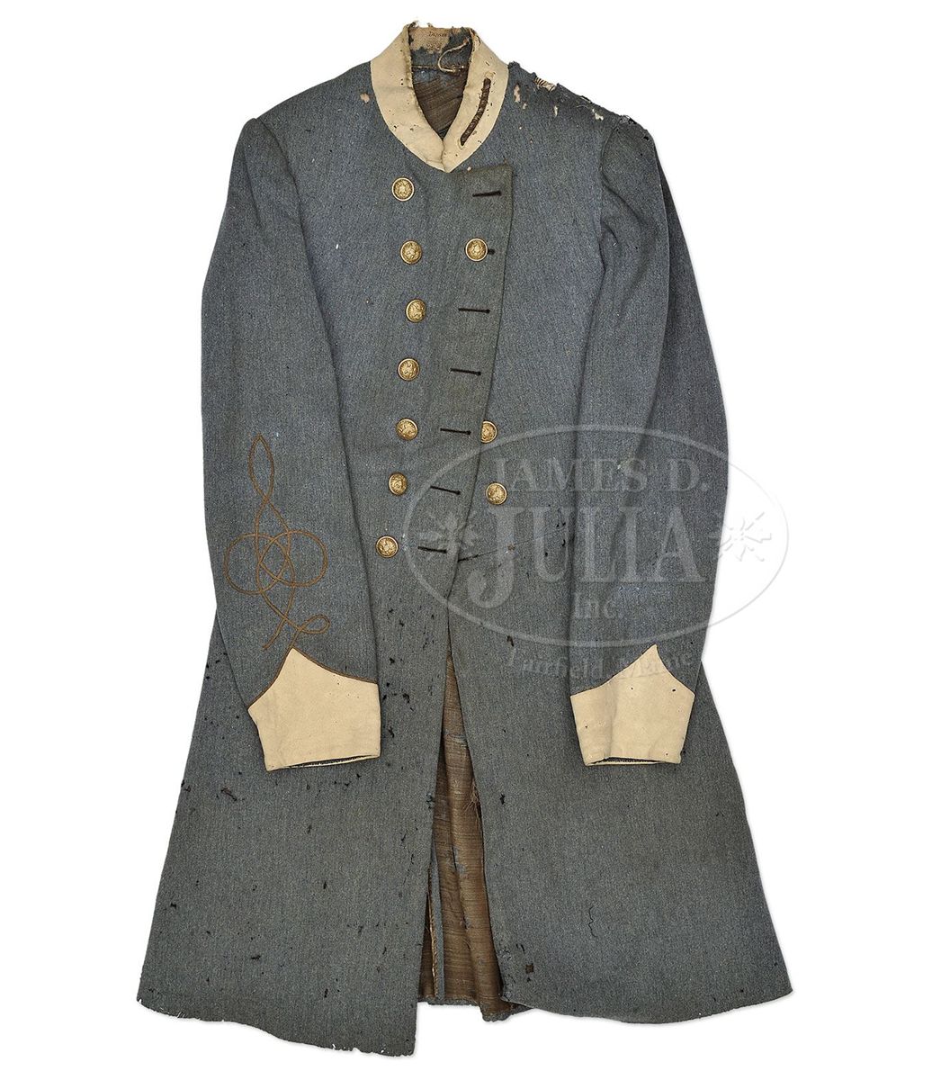 Claudius Baker Denson was born in Portsmouth, Virginia. He founded the Franklin Military Academy in Duplin County, NC. In April 1861, Denson and his students enlisted in the Confederate army as the "Duplin Grays" as Company B, 20th North Carolina Volunteers. Denson left this company where he was Captain and eventually served as a First Lieutenant in Company A Second Regiment Confederate Engineers. This would have been the coat that Lt. Denson wore through the end of his service in 1862 while writing love letters to his future bride Matilda Cowan who he married in 1863. Lt. Denson's letters to Matilda are found in large archive of Cowan and Denson family papers in the North Carolina Room of the New Hanover County Public Library in Wilmington, NC. This is a wonderful opportunity to obtain a fine identified regulation Confederate frock coat with buff facings (staff & field), First Lt. collar insignia and single strand quatrafoil on sleeve. This coat overall is in fine condition and could be easily restored by competent conservator and would display beautifully. PROVENANCE: Cowan and Denson Family. CONDITION: Coat is very good overall with scattered moth damage especially on top of left shoulder where there are two holes about 1" x 1". The cadet gray color is good with scattered areas of soiling and staining. Buff faced cuffs are sound with scattered moth damage. Collar facings have areas of moth damage, especially on back as can be seen in photos. The interior of coat has scattered moth damage especially on back of collar which has large reductions. Lining is about 70% intact with losses as can be seen in photos. Internal tail pockets and breast pocket are lined with bright blue polished cotton. Light blue sleeve linings are intact. "DENSON" is inked on back of heavy cotton canvas stiffener for collar. Collar retains only the left bullion First Lt. bar and only the right strand of single Lt.'s quatrafoil on sleeve. Double breasted frock retains ten of its orig "EXTRA QUALITY" back marked 22mm General Staff Officer's buttons on face (though three are loose) and three of its orig General Staff buttons on tails. 4-48698 JS213