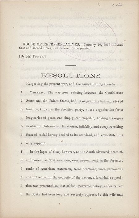 Confederate imprint, a House Reolution, Richmond, Jan. 20, 1863, 6pp. 8vo., (P&W #535), virulently attacking Lincoln and his Northern supporters. In part: "...The war...had its origina from bad and wicked fanatics, known as the abolition party...holding its orgies in obscure club rooms; fanatacism, ifidelity, and every revolting form of scial heresy flocked to its standard...the Black Republican party, impelled by fiendish fanatacism...made war upon the institution of slavery...went so far as to proclaim the equality of the black with the white race...instigating the indiscrimanate butchery of women and children...we defy [Lincoln's] power and scorn his odious abolition proclamation...puritanical, God-forsaken mischief making Bew England States...". Much more. Very good.