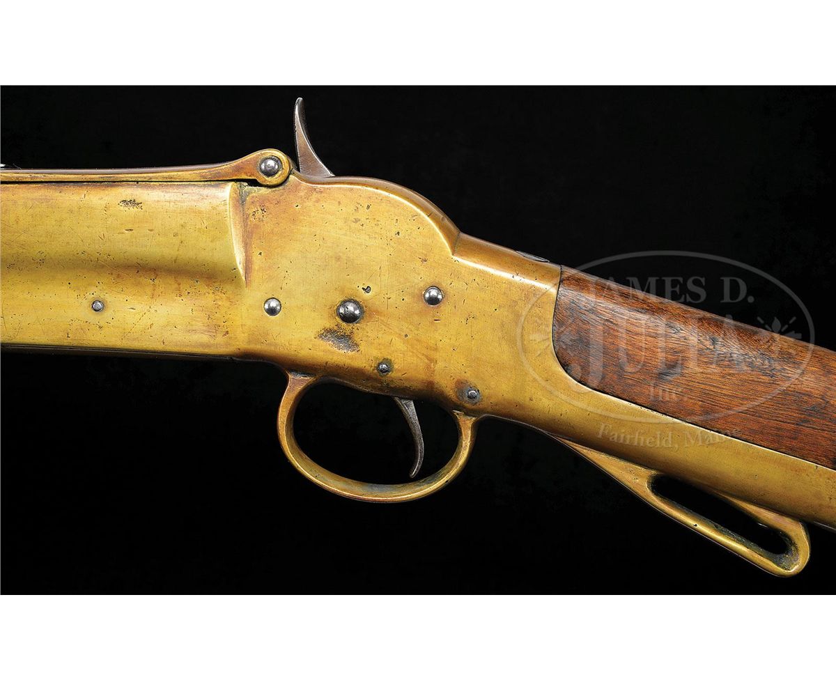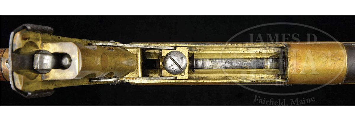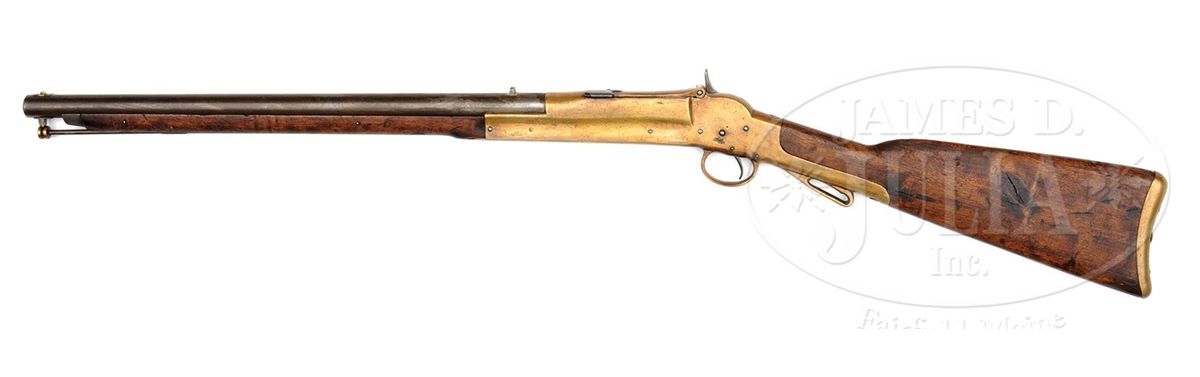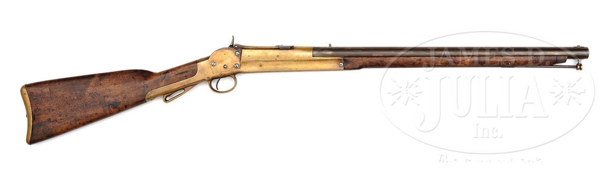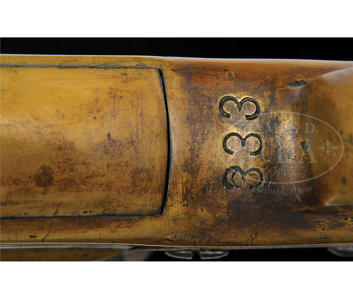 SN 333. Cal. 50. This is the scarcest model of the Morse carbines with only about 100-150 made and this is a fine original and authentic example. The Second Model (or Type II) Morse carbine, produced at the State Military Works in Greenville, South Carolina, is distinguished by a more sophisticated locking and firing mechanism. Included in this improved mechanism is the presence of a flanged iron rod connected to an iron plate with knurled edges which covers the forward top portion of the brass operating lever. The serial number range for this type of carbine is from 200 to the near 350 range. This carbine is serial numbered 333. This is an overall very nice example of the popular Confederate Morse Carbine with an especially nice stock clearly showing the burl and knots not normally picked for gun stocks, which clearly shows the Confederacy used any functional resources. CONDITION: Brass surfaces are scratched and cleaned with numerous small dings and stains. Bbl is gray/brown overall with scattered staining and pitting. Buttstock retains much of its orig varnish. Cryptic letter "C" in buttstock is well struck and discernible. Mechanically gun functions well with well defined rifling in bore. Stocks are sound and solid with about a 1-1/2" patch repair at toe of buttstock. 4-49365 JS204