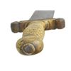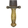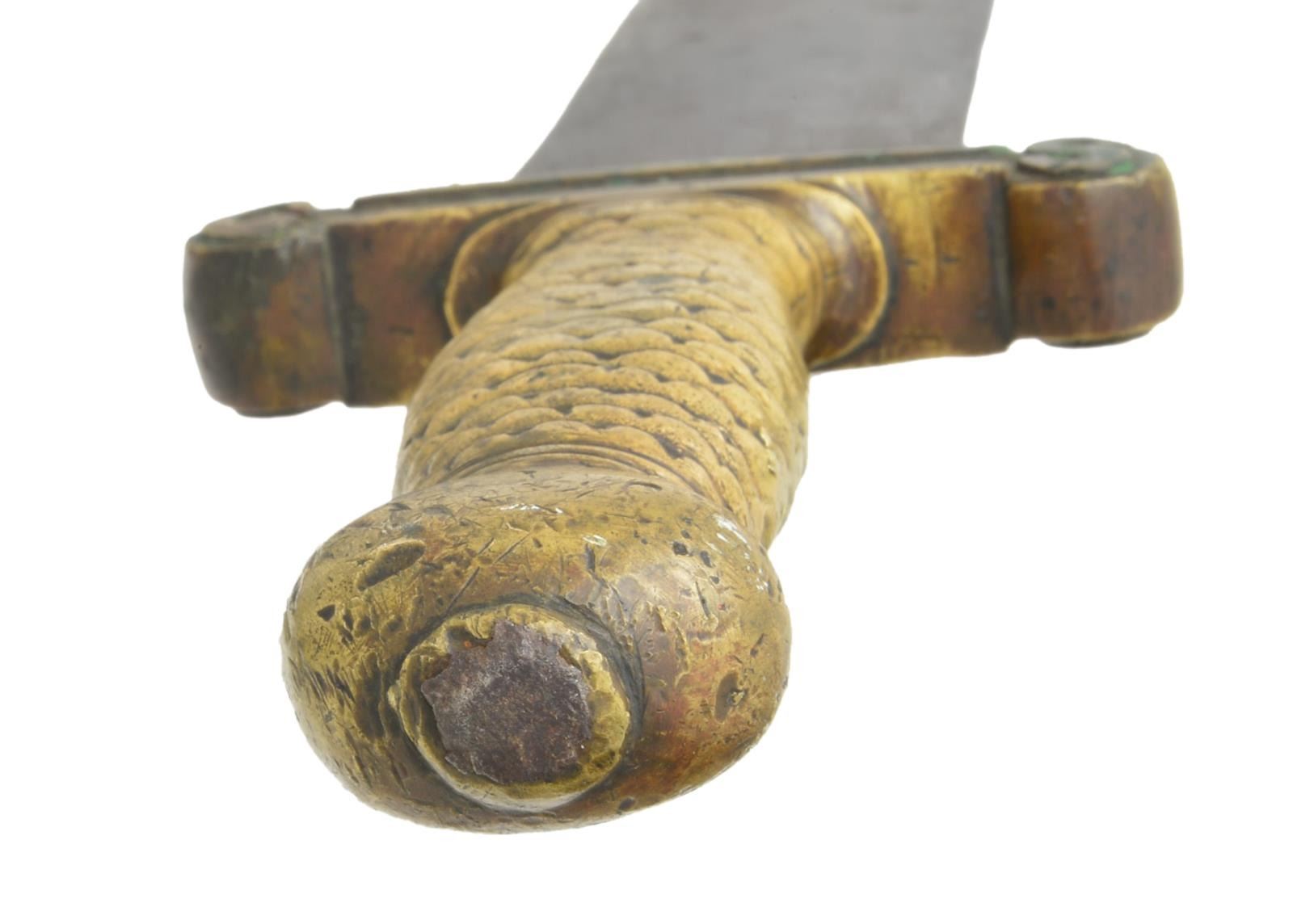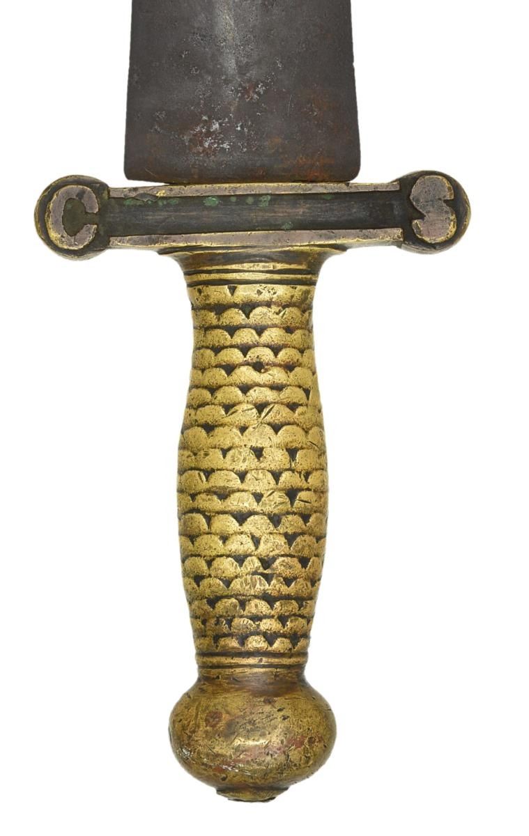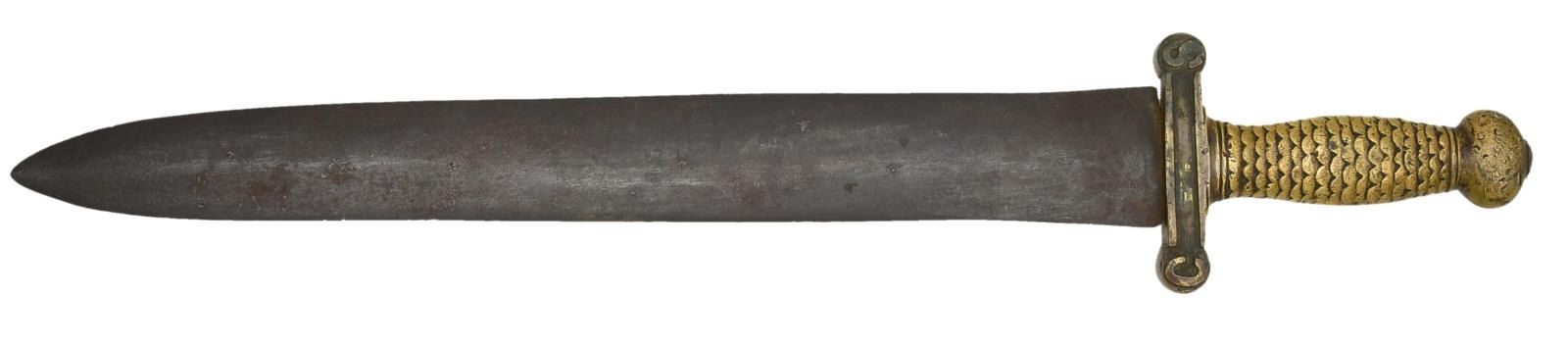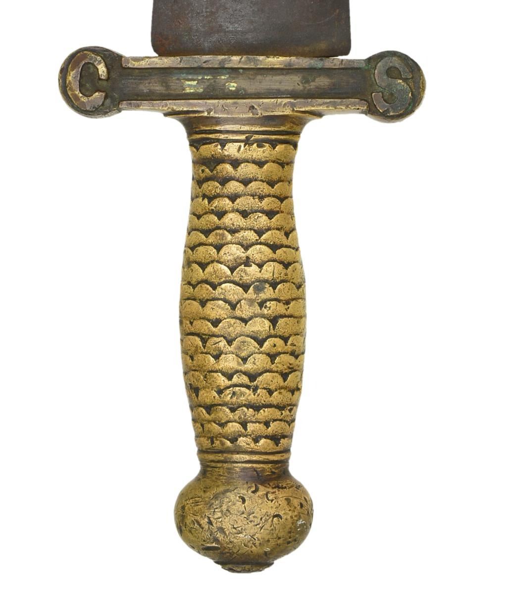 RIGDON, COLUMBUS MISSISSIPPI. 23.5" Overall, 17.5" double-edged blade, 2.25" wide, .28" thick. This massive short sword w/ CS letters at opposite ends of guard has been highly reproduced due to his popularity. This example has impeccable surfaces & great original patina. The CS letters are so similar to those on known Leech & Rigdon products, it is fair to assume they made the sword & were among the largest deep South sword manufacturers. CONDITION: very good overall, uncleaned w/ mixed mustard to chocolate colored patina to brass. The blade has dark iron patina w/ 2 tiny nicks in cutting edge. (02-15147/JS). $4,000-5,000.