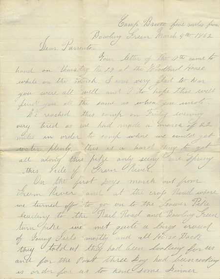 A.L.S. of John F. Thomas, 4pp. 4to., Camp Bruce "five miles from Bowling Green", Mar. 4, 1862, in pencil to his parents in Cincinnati, Ohio. Thomas describes the fortifications at Camp Bruce, in part: "...We reached this camp as when you wrote. Very tired as we had made a march of 22 miles in order to camp where we would get water plenty. This is a hard thing to get all along this pike only seeing one spring this side of Green River. On the first day's march out from Green River and at the cross road where we turned off to go on to the Lower Pike landing to the Rail road and Bowling Green we met quite a large crowd of young girls mostly...they told us they had been looking for us and for the past three day had been cooking in order for us to have some dinner....The Ladies told us they had got the dinner up just for the 1st & 2nd Ky Regt's. We could not stay long...". Thomas then describes the sorry state of the Louisiana-Nashville railroad and goes on: "...The fortifications at Bowling Green are very strong and large with seven batterys each one protecting the other. There is but two ways of entering the works and at these places not much [more] than five men can go in a brest if we would of been oblige to have attacked them here we would of been murdered...the Brest worke were two ten high so as to have one tier of men above the other with a very large trench in front of them...". With original postal cover. Folds, very good.