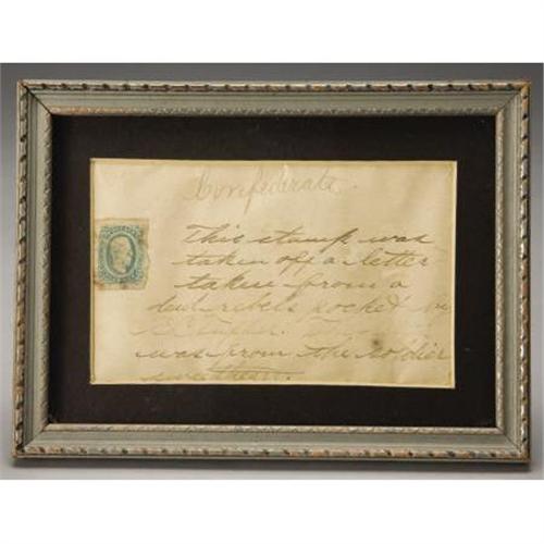 <B>GREAT Confederate postage stamp from the body of a DEAD REB! </B></I><B><I>Taken as a souvenir by a Pennsylvania Bucktail soldier!</B></I></B></I><BR><BR> - Truly unique and one-of-a-kind Civil War relic, souvenired as a prize by Corporal Colby C. Tupper of Co. G of the 150th Pennsylvania Infantry “Bucktails,” and accompanied by superb provenance and documentation in the form of an original note penned in old browned ink on the back of a period piece of lined stationery, upon which said prize has been glued, i.e., a blue 10-cent canceled Confederate States postage stamp bearing the portrait of President Jefferson Davis (see close-up) and having a most extraordinary history.<BR><BR>Note reads as follows: “This stamp was taken off a letter taken from a dead Rebel’s pocket by C. C. Tupper. The letter was from the soldier’s sweetheart.” Also inscribed along the top in the same hand is the additional descriptor “Confederate." Note itself measures 3.75 inches by 5.75 inches in actual size and long ago was matted and framed, an adhesive substance having been expertly applied along a one-quarter-inch perimeter of the paper to keep it properly aligned against the rear of the mat (perfectly reversible if so desired). Overall condition is very good to excellent, save for one very small tear at the lower right hand corner, as visible in scan.<BR><BR>Although Colby C. Tupper’s surname is incorrectly entered in both the Pennsylvania rosters and the Civil War online database as “Tripper,” the accuracy of the spelling as presented here is absolutely and conclusively substantiated by his name as it appears on his National Archives pension file and the Pennsylvania soldiers’ monument at Gettysburg (see photos), where he was wounded on July 1st of 1863 and where, in fact, he could have very well found and retrieved this piece. One of the most unusual aspects of this exceptional relic is that the small CS stamp apparently held a greater fascination to Corporal Tupper than the letter itself, which perhaps due to its personal nature, may have been discarded at the time purely out of respect to his fallen enemy. In any event, a marvelous Civil War artifact. <BR><BR><B>Condition:</B></I> Fine-very fine.<BR><BR><b>Shipping:</b> Framed - with Glass, Small (<a target="_blank" href="http://www.heritageauctions.com/common/shipping.php">view shipping information</a>)
