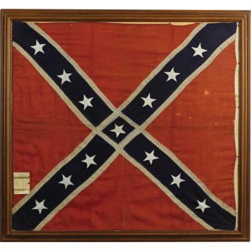 <B>CONFEDERATE BATTLE FLAG CAPTURED AT MACON, GEORGIA ARSENAL APRIL 2, 1865.</B></I> Prior to its purchase by the Confederate government, Macon Arsenal existed as the Findlay Iron Works and produced railroad components such as car wheels and steam engines. The arsenal began producing ordnance for the Confederacy on May 10, 1862 and was commanded by Lt. Col. Richard Cuyler. Initially 6 and 12 pdr. Guns were produced and in November 1862 the arsenal began the manufacture of Napoleons and Parrots. The arsenal also produced and stored ammunition and accouterments. Sherman surprisingly bypassed Macon and the arsenal on his “March to the Sea” but the employees were called out to defend it on several occasions in 1864, possibly carrying this flag. The city and arsenal were finally taken in April 1865 by Union forces under the command of Gen James Wilson, when this flag was captured. The flag is constructed of wool bunting with 3 ½” white cotton stars and a 1” wide white cotton muslin hoist.. The flag measures 47” on the hoist and 51 ½” on the fly. Rolled stitched edge probably containing a cord core. The cross is 5 ¼” wide with a 1”white border. Constructed with three stars on each arm of the cross and one star in the center. The hoist exhibits no provisions for attachment and probably originally included ties or possibly meant to be nailed directly to a staff. The flag is accompanied by an old 3 ¾” X 4 ¾” paper tag with the following inscription in brown ink “The Macon Ga./Arsenal Rebel Flag/captured/April 2nd/1865” additionally, written at the bottom in pencil “The gift of Silas C. Stevens April 1915” probably on the 50th anniversary of the flag’s capture. A striking and historically important Confederate battle flag with excellent history.<BR>This flag is from the Chicago Historical Society's famed Gunther Collection and included in their catalog.<BR><B><BR>Provenance: </B></I><I>Chicago Historical Society dexecessed to Arnold Chernoff</B></I><B></B></I><BR><BR><B>Condition: </B></I>Overall very sound. All colors bright, all stitching tight. Just a few small areas of loss/damage really very minor, as can be seen in the photograph. The flag has been framed for presentation.<BR><BR>This flag has been carefully examined by authoritative in-house experts and has been deemed to be authentic and of the period in every respect including fabric, thread, dye and the method and pattern of construction. Additionally, any accompanying provenance has been verified as unique and indigenous to the specific flag it documents.<BR><BR><b>Shipping:</b> Framed - without Glass, Large (<a target="_blank" href="http://www.heritageauctions.com/common/shipping.php">view shipping information</a>)