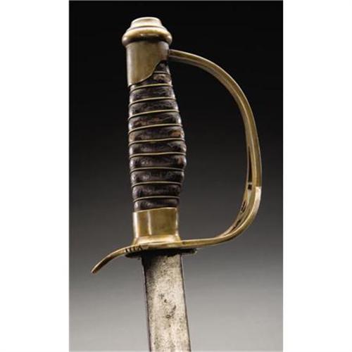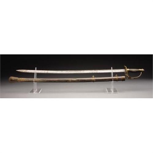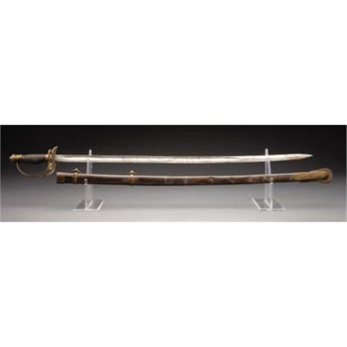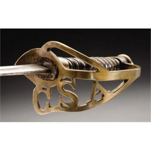 <B>CONFEDERATE STAFF OFFICER’S SWORD AND SCABBARD MADE BY THE CONFEDERATE STATES ARMORY KENANSVILLE, NORTH CAROLINA</B></I>. - The Confederate States Armory produced a wide variety of edged weapons from 1862 - 1865 and was a large private enterprise operated by Louis Froelich. This is doubtless, visually, the most striking of all the Confederate officer’s swords. The brass guard, which appears to be sheet brass but is actually cast, incorporates the cutout letters CSA. Distinctive brass grip ferrule and pommel. The guard characteristically bears the Roman numeral VIII at the edge of the quillon. Leather wrapped grip grooved to accept the single strand brass wire wrap. Retains the original leather washer. Unetched 32 ¼” blade with rather crude single unstopped fuller. A very nice example of this extremely desirable Confederate officer’s sword and scabbard. <BR><BR><B>Condition: </B></I>All brass with nice patina. Grip covering shows wear but about 80% intact and very sound, wire wrap tight. Blade clean and bright with scattered light pitting overall, no nicks or sharpening. Scabbard with deep dark untouched patina and some scattered surface rust, a bit heavier toward the drag. Brass mounts with dark untouched patina. <BR><BR><b>Shipping:</b> Requires 3rd Party Shipping (<a target="_blank" href="http://www.heritageauctions.com/common/shipping.php">view shipping information</a>)