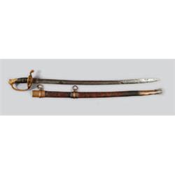 CONFEDERATE STAFF OFFICERS SWORD. Made by Boyle & Gamble of Richmond, VA for Mitchell & Tyler of Richmond, VA. 29-1/2” blade is etched with patriotic motifs including “CS” and rarely encountered mottoes “Hope” in a shield and a ribbon with “Victory or Death”. CONDITION: Blade etch is only 50% plus remaining but both mottos are easily read as is “CS” and part of maker, “Boyle & Gamble” is partially readable at ricasso. Grip is perfect, complete leather and wire. Hilt is perfect with sharp detail in basket including a star over “CS”. The small twisted wire and longer ricasso are typical of Mitchell & Tyler products. Scabbard is complete with correct grips mounts of Boyle & Gamble manufacture. Drag appears to be old replacement. 8-75979 JS4