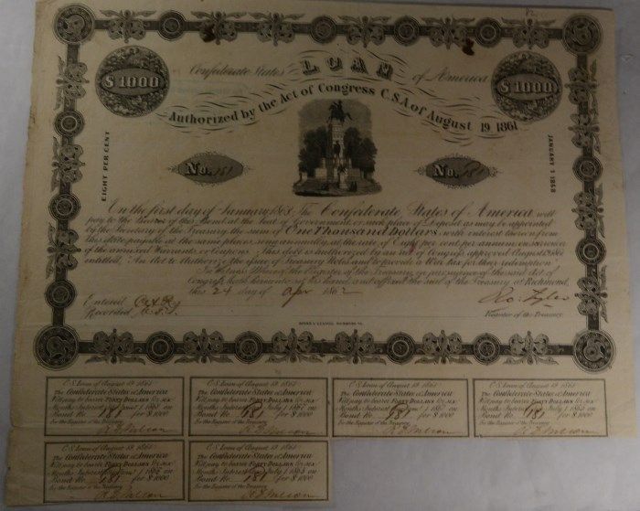 CONFEDERATE STATES OF AMERICA BOND, 1862, $1000.00 VF/FINE WITH 6 COUPONS