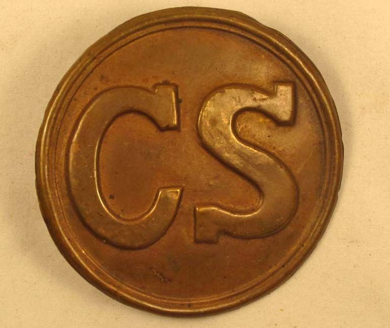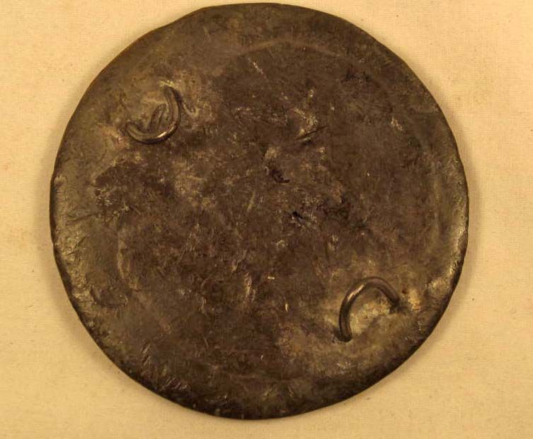 Approx. 2 1/2" diameter. Stamped brass construction w/ a lead filled back. Has two prongs on the reverse side for securing to the belt.