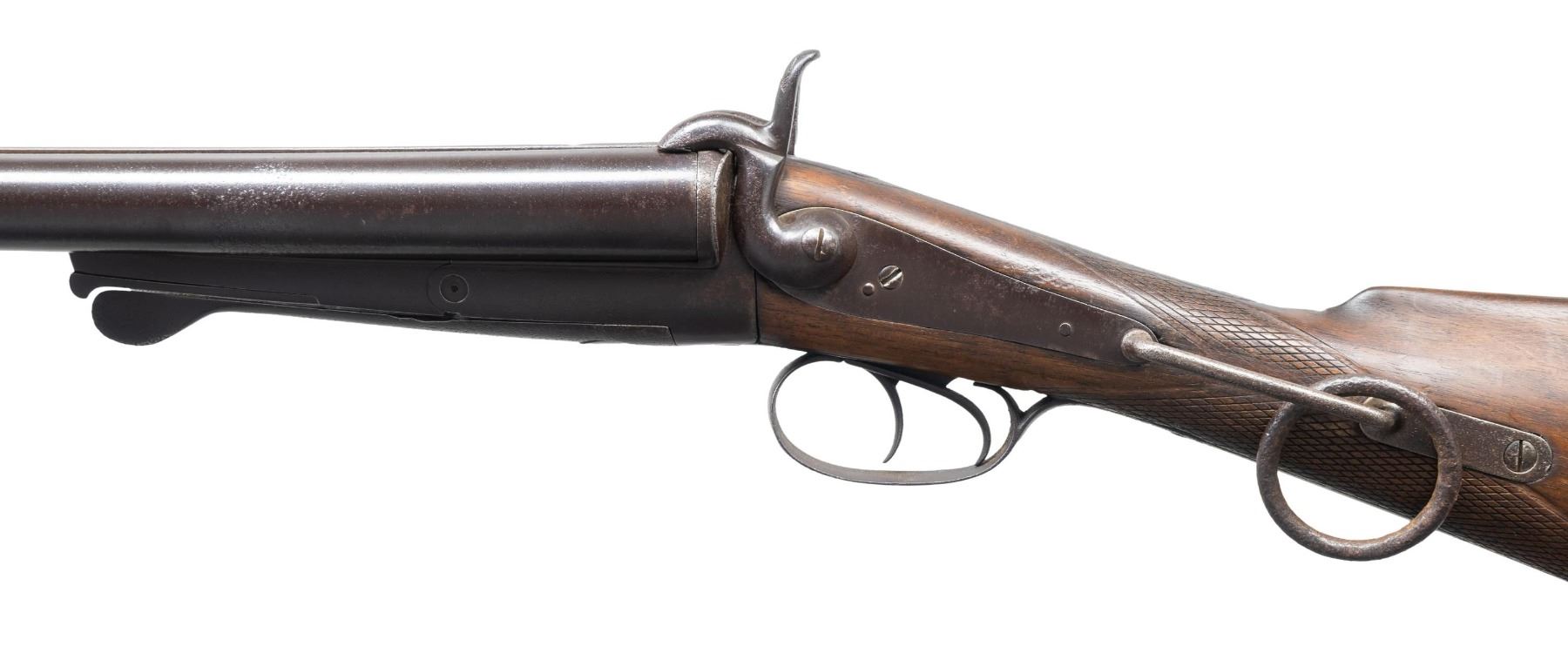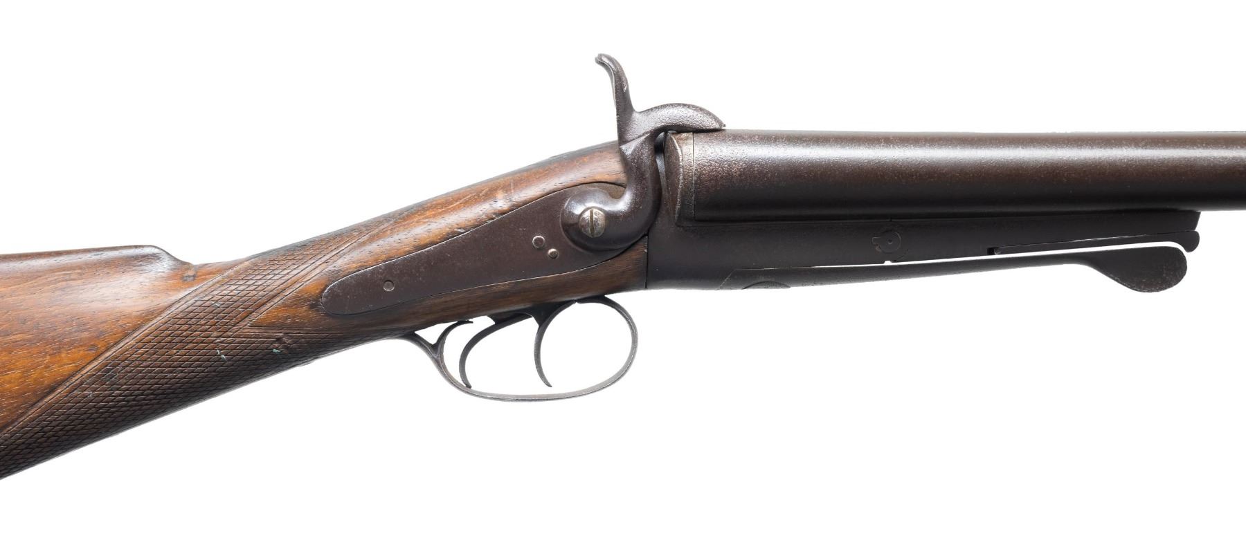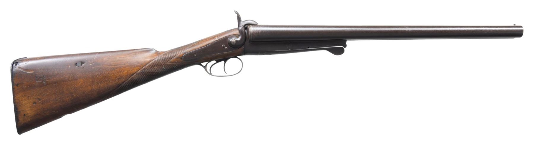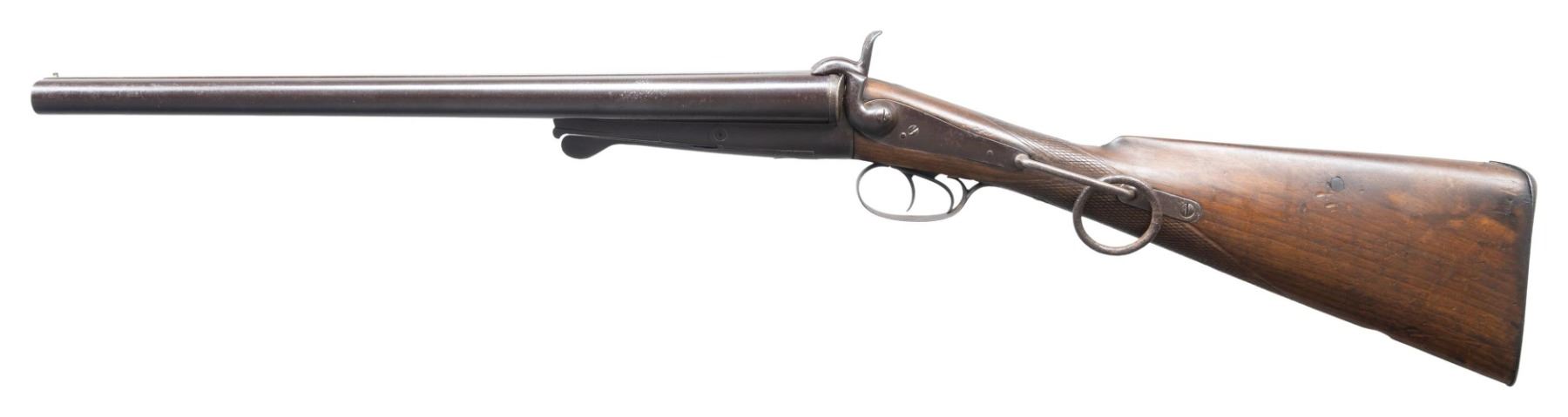 Cal. 12ga (18mm) pinfire. S# 4057. 34.5" overall, 18" damascene barrels, central rib "REAL TWIST", Liege proofs, unmarked back action locks, added saddle ring bar & small brass post sight, checkered walnut stock, small St. Andrews cross flag carved into right side. CONDITION: good, all iron pitted, mechanics functional but left hammer has hair trigger and falls, clear smooth bore. PROVENANCE: Donald Tharpe Collection; Heritage Auctions, lot 72245, June 24, 2007; The Esteemed Norm Greenberg Collection. (01-27714/JS). ANTIQUE. $800-1,200.