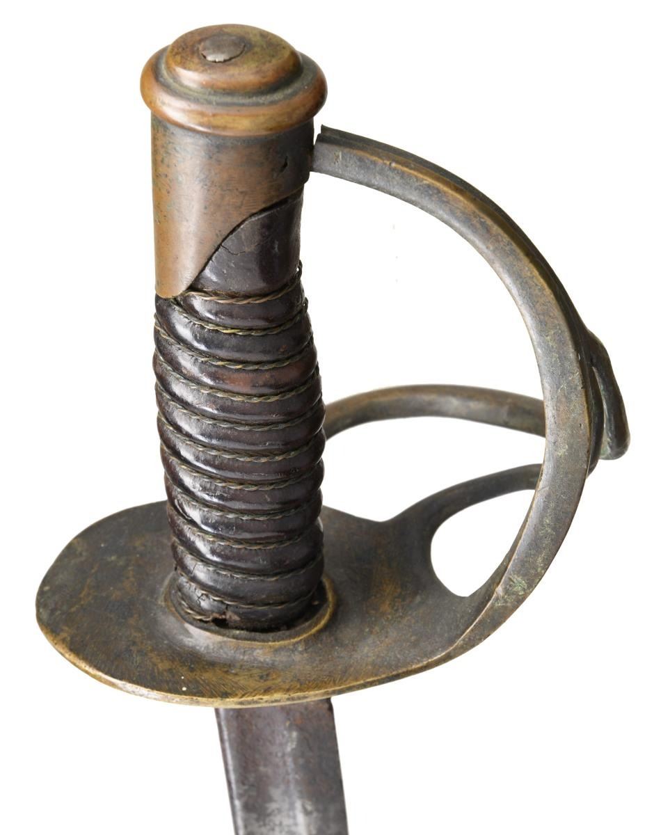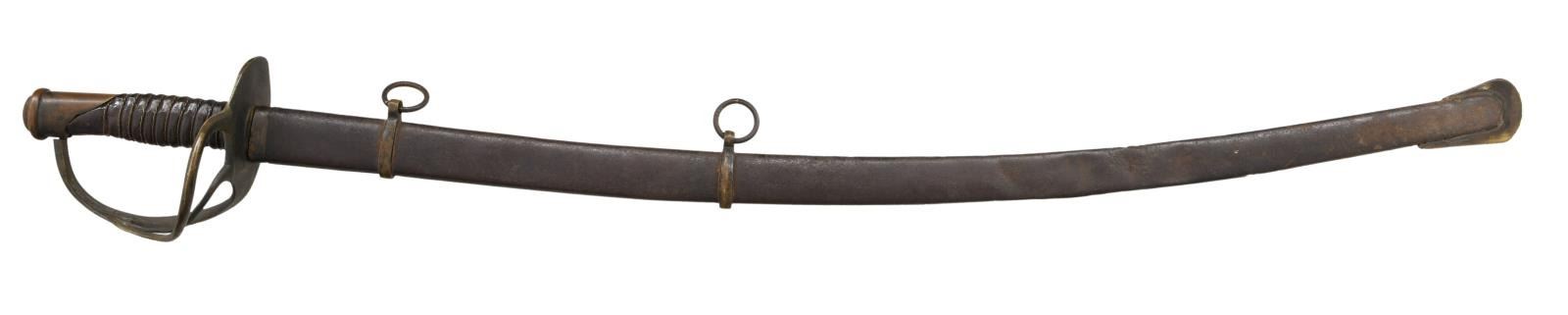 SCABBARD. 34" forged blade with crude square ricasso similar to several Tennessee and North Georgia makers but different, forging flaws are present. The large flat guard very similar to Memphis Novelty Works sabers but unmarked. The brass mounted braised seam scabbard is also like products of Memphis Novelty works. Memphis Novelty Works is the only Confederate saber maker I am aware to use spring teeth in their brass throats. CONDITION: good-to very good overall, appears all original, including US 1860 style grip & twisted wire, pommel has been repeened. The scabbard fits well and appears original to use, the brass drag is restoration. (02-19334/JS). $2,000-2,500.