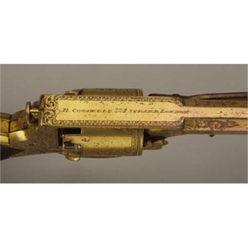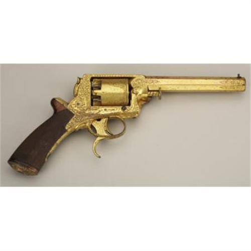 <B>CONFEDERATE THOMAS GRISWOLD & CO. CASED ENGRAVED GOLD WASHED TRANTER DOUBLE ACTION .44 CALIBER PERCUSSION REVOLVER.</B></I> An absolutely magnificent gun with superb Confederate association. The gun is exquisitely engraved at the muzzle and rear of the barrel, loading lever, cylinder, trigger guard and rear strap, butt cap, and frame, with very tight and delicate scroll and shell motifs. Butt cap and loading lever screws also engraved. All metal parts, except screws which are blued, are covered with a heavy gold wash. Hand engraved “B. Cogswell 224 Strand London” on the top of the frame, HH stamped on the side of the frame and “W. Tranter’s Patent die stamped on loading lever and trigger. The one piece walnut grip is checkerd over 90% of its surface with a tight diamond pattern. Most importantly, executed with a single stamp in tiny letters on the top flat of the barrel is “Griswold & Co. N. O.”. This appears to be underneath the gold wash indicating the finish was applied after its arrival in America. Griswold took over operations from Hyde & Goodrich in August 1861. A number of English revolvers are known bearing the agent’s mark of Hyde & Goodrich and this revolver doubtless through the hands of Griswold shortly after he took over to business. The gun is presented with all accessories in the original walnut case. The case is assembled with brass screws along the top and bottom edges and a circular brass escutcheon is inset in the top of the lid. Brass key escutcheon and closure is accomplished with two flat brass hooks. The case is lined in green wool with a paper lable for Cogswell pasted on the inside lid. The casing includes: oiler, paper covered tin for percussion caps by F. Joyce, bag shaped copper flask, screw driver and nipple wrench with checkered ebony handles, japanned tin with green paper lable for “Tranter’s Patent Lubricating Bullets”, patch cutter, ebony handled cleaning rod, wooden container with five extra nipples, double cavity brass bullet mould with blued iron sprue cutterand the original key for the case. A striking case set with very rare markings to a known Confederate outfitter. <BR><BR><B>CONDITION: </B></I>Bright gold wash with just some minor speckling and some minor wear on the loading lever and plunger and the butt cap. Gun overall appears to be unfired with no scorching on the face of the cylinder. Mechanically perfect, nipples mint. Bore excellent - mint and all screws retain 95% of the original blue. Checkered walnut grip also about mint. All accessories excellent as is the casing, just showing some minor scratches with nice rich patina. Lining just shows some very minor wear.<BR><BR><b>Shipping:</b> Requires 3rd Party Shipping (<a target="_blank" href="http://www.heritageauctions.com/common/shipping.php">view shipping information</a>)