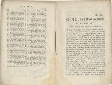 Confederate tract, 8pp. 8vo., South Carolina Tract Society, published by Evans & Cogswell, Charleston [n.d.], #103, An Appeal to Young Soldiers. By a Young Lady. The tract uses a great deal of Biblical references to convince potential enlistees of the importance of their decision to join up, also citing: "...The goodness of the cause...The certainty of victory...The pleasantness of the service...The greatness of the reward" with constant references to the "King of Kings" being a Southern sympathizer of sorts. With a list of all tracts published by the society, Light water stain, else very good.