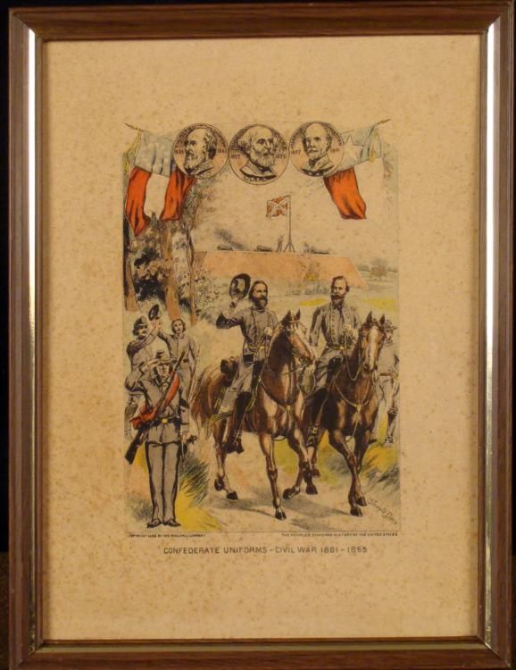 CONFEDERATE * UNIFORMS-CIVIL WAR 1861-65 ANTIQUE PRINT ON BOARD BY I. STEEPLE DAVIS-COPY * 1898 * PRINT * IS 9X12"--SHOWS CONFEDERATE CIVIL WAR CAVALRY SOLDIERS AND INFANTRY--HAS * GENERALS ON TOP INCLUDING JACKSON & LEE--WITH CONFEDERATE FLAGS--LOWER * PORTION OF PRINT READS "COPYRIGHT 1898 BY THE WOODFALL * COMPANY"-ARTIST SIGNED- "THE PEOPLE'S STANDARD HISTORY OF THE * UNITED STATES--BOTTOM READS "912/43" -"BERNARD PICTURE CO, * INC-NEW YORK CITY" SHOWS AGE