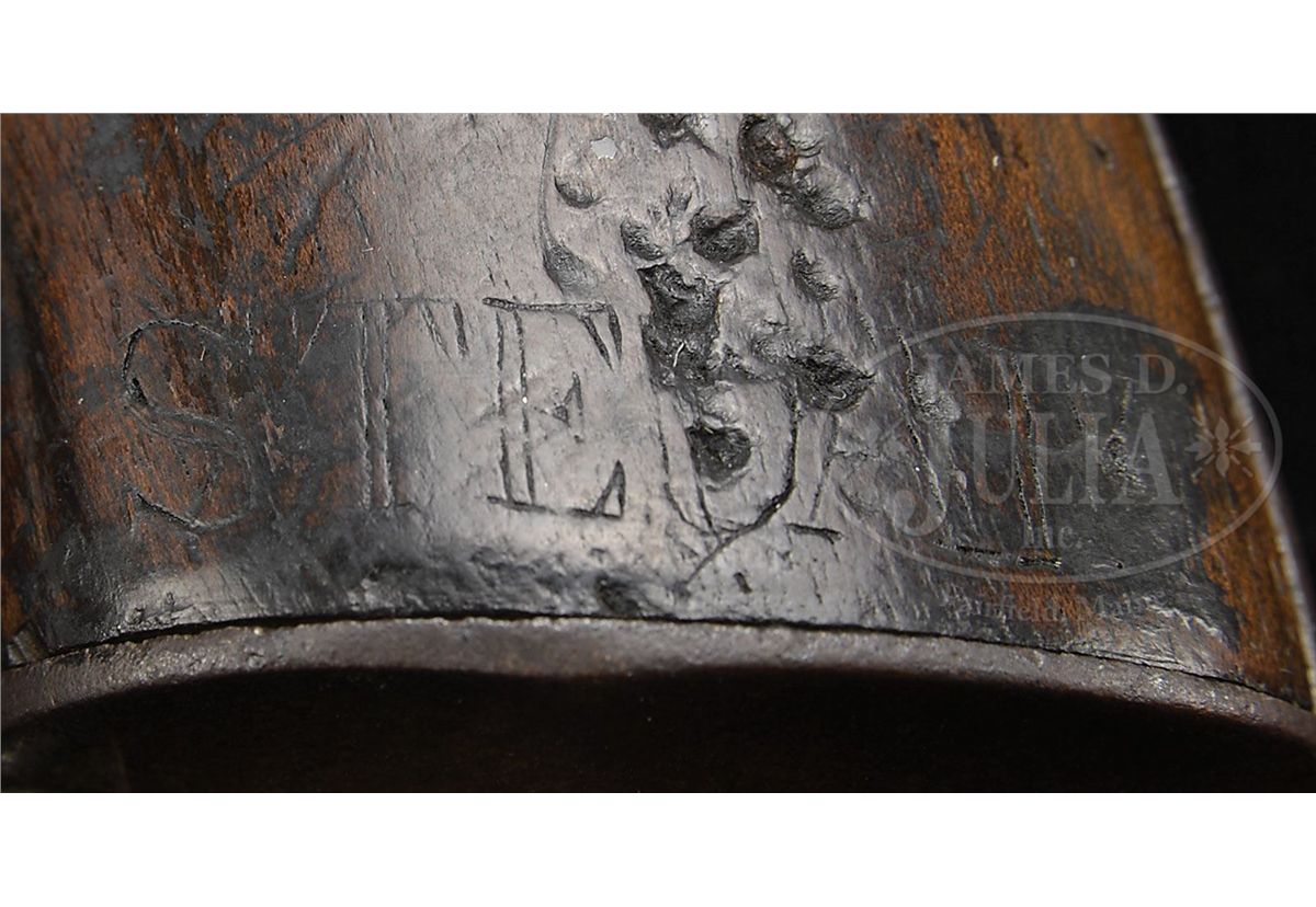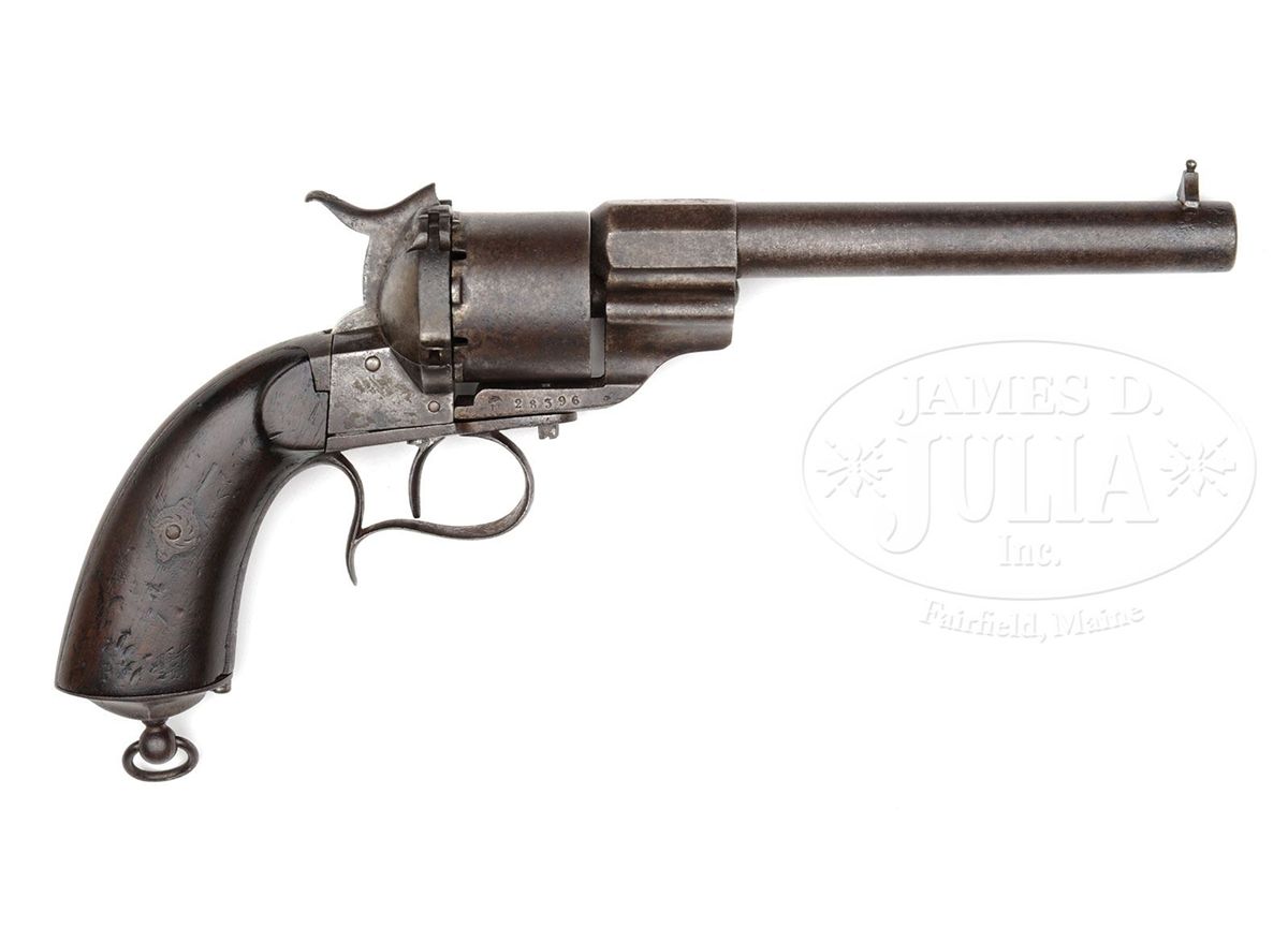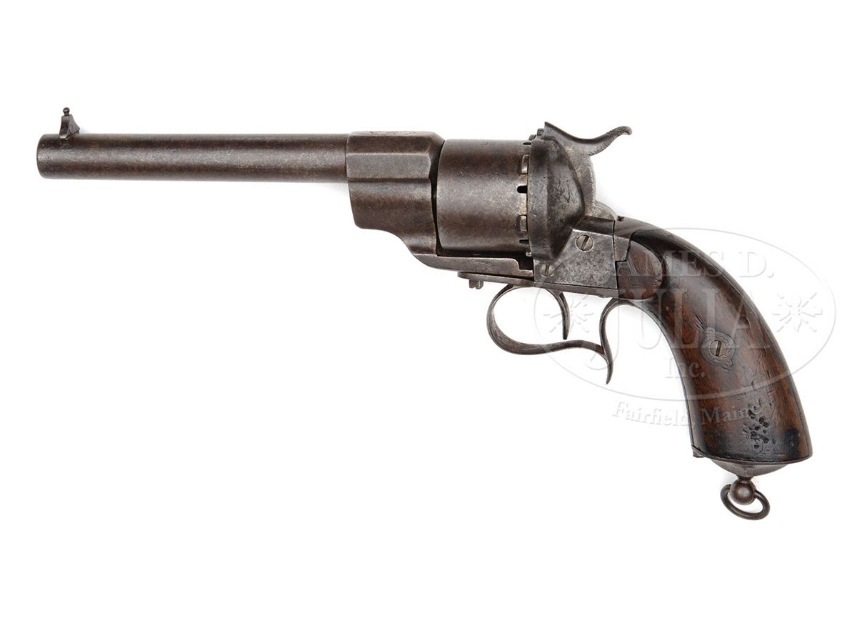 SN 28396. There is no doubt that the Confederacy used many of this military model LaFaucheux based on other identified guns, including one used by Stonewall Jackson and excavated examples. This 12mm pin fire revolver should date very close to Capt. George Steuart's stint as Captain in the 1st Maryland Infantry in 1861. Impeccably scratched into the base of stocks "STEUART", "1*MD". Accompanying this lot is a CDV of Steuart in Confederate General's uniform and a document signed as Capt. December 1860 while still in the US Army. George Hume Steuart (August 24, 1828 – November 22, 1903) was a planter in Maryland and an American military officer; he served thirteen years in the United States Army before resigning his commission at the start of the American Civil War. He joined the Confederacy and rose to the rank of brigadier general in the Army of Northern Virginia. Nicknamed "Maryland" to avoid verbal confusion with Virginia cavalryman J.E.B. Stuart, Steuart unsuccessfully promoted the secession of Maryland before and during the conflict. He began the war as a captain of the 1st Maryland Infantry, CSA, and was promoted to colonel after the First Battle of Manassas. In 1862 he became brigadier general. After a brief cavalry command he was reassigned to infantry. Wounded at Cross Keys, Steuart was out of the war for almost a year while recovering from a shoulder injury. He was reassigned to Lee's army shortly before the Battle of Gettysburg. Steuart was captured at the Battle of Spotsylvania Court House, and exchanged in the summer of 1864. He held a command in the Army of Northern Virginia for the remainder of the war. Steuart was among the officers with Robert E. Lee when he surrendered to Ulysses S. Grant at Appomattox Court House. CONDITION: Gun is gray/brown overall. Gun is mechanically functional, rotating cyl though missing loading assembly and tip of hammer. There is silver inlaid engraved "CSA" in old English script on top of bbl housing which appears quite old and could be contemporary to the war or at least commemorative though the name scratched in stock appears contemporary to the guns time of use and manufacture circa 1860-1862. 4-49691 JS216
