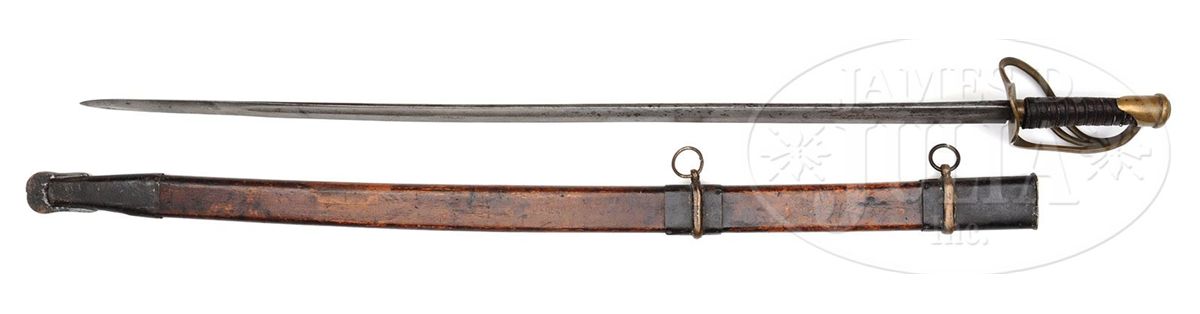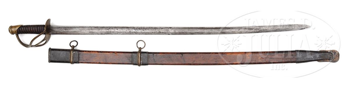 This is a nice example of the classic wood scabbard saber that is thought to have been made by either Marshall of Atlanta, GA or Kraft, Goldschmidt and Kraft of Columbia, SC. Often these swords are in poor condition, especially the scabbard, since they broke so easily. This scabbard is sound, still retaining much of its orig finish on mounts and body. The orig throat, which is often missing, is also retained here. This scabbard body is also tight and unopened. Grip retains its orig iron wire on painted wood grip that almost appears to have never had a leather wrap. The blade is 35" with unstopped fuller, typical of this pattern. PROVENANCE: Dr. Andrew Kelley Collection. CONDITION: Blade is gray with scattered areas of staining and pitting with a few small nicks in cutting edge. Protective washer is missing. Iron wire single strand wire is tightly wrapped around carved wood grip with no remnants of any leather. Brass ferrule and hilt are loose due to loss of leather washer. Hilt and pommel exhibit good brass patina, as do scabbard, ring mounts and drag. Scabbard body is sound and solid with numerous small scratches, stains, dents and abrasions. Sheet metal mounts retain much of their orig black paint, still partially covering brass ring, mounts and brass drag. Thin coating of varnish or shellac covers much of the scabbard body and mounts, which appears orig manufacture. 4-48847 JS14
