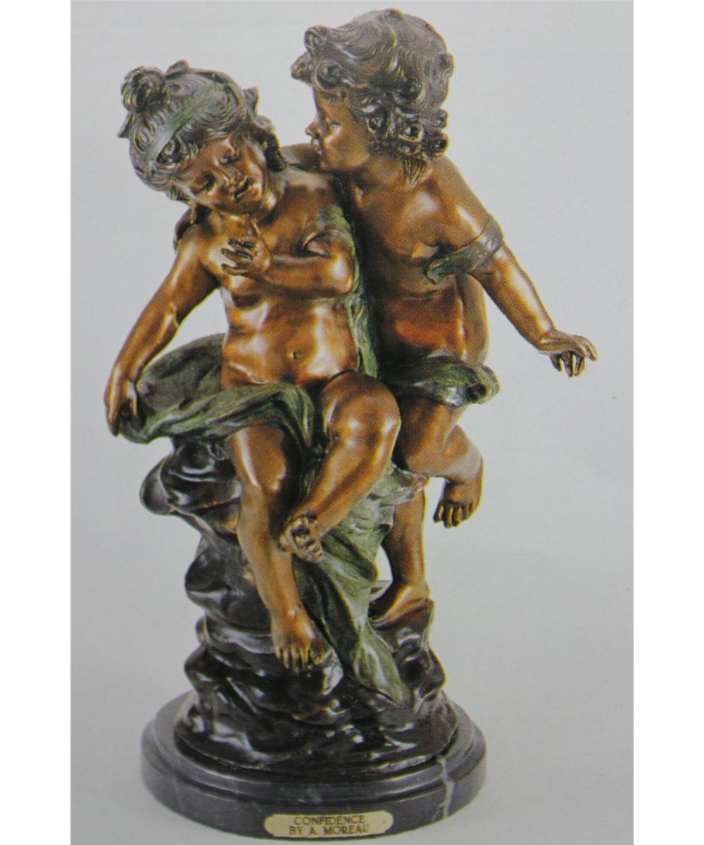 "CONFIDENCE" BRONZE SCULPTURE - AFTER A. MOREAU - BEAUTIFUL COLOR PATINA - MOUNTED ON A FINE ITALIAN MARBLE BASE - BEAUTIFULLY DETAILED - SIGNED - MINT CONDITION - 22"H X 11"W - LOST WAX CAST BRONZE