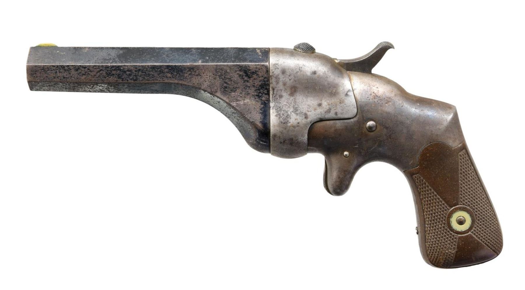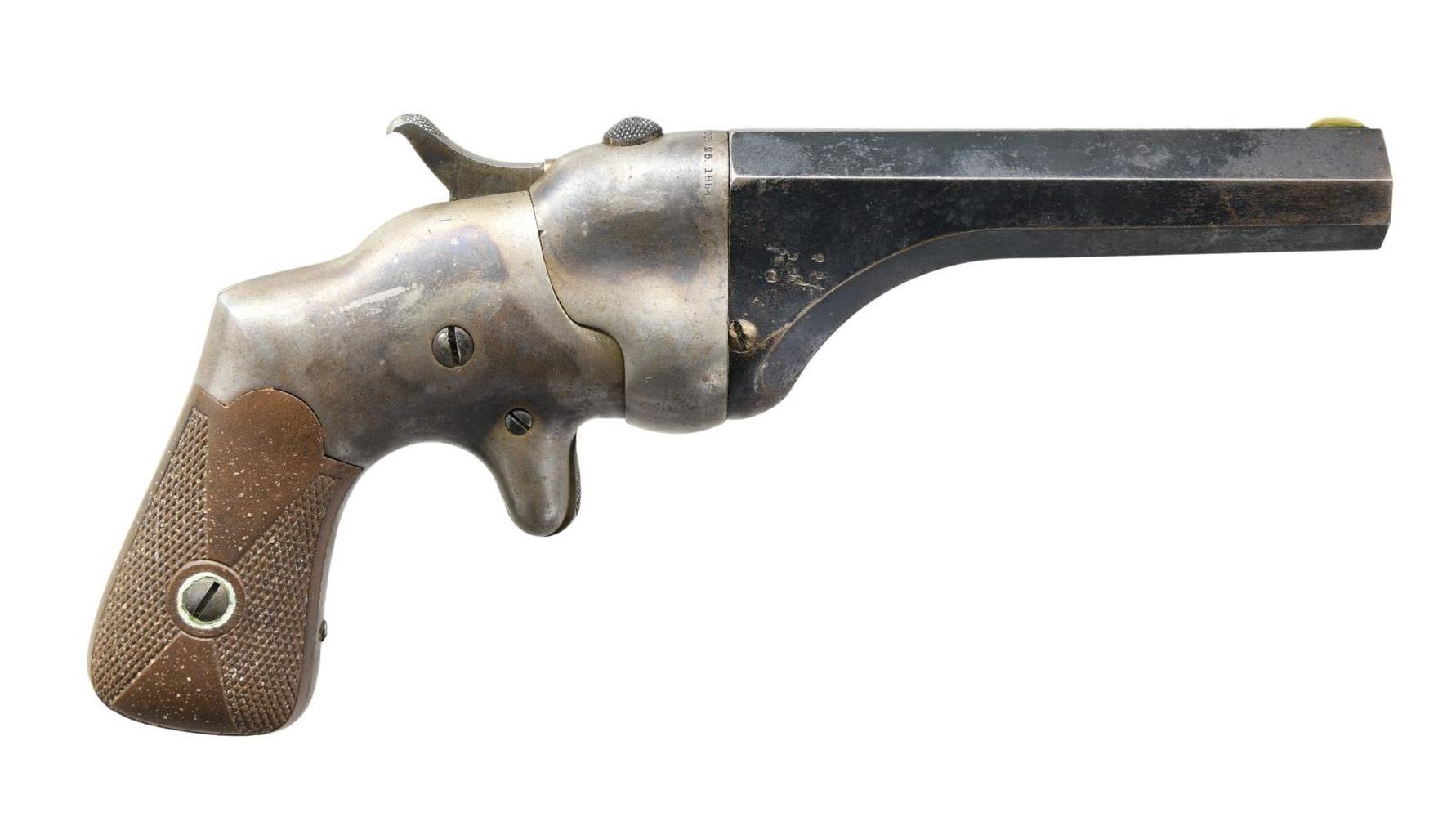 BREECH SINGLE SHOT PISTOL. Cal. 44 RF. S# 3995 (beneath left grip panel). Bbl. 4". Bull Dog swivel breech pistol mfg. by Connecticut Arms & Manufacturing. Top flat of the faceted bbl. is marked "CONNECTICUT ARMS & MANF'G Co NAUBUC CONN", with "PATENTED OCT. 25.1864" marked over the top of the breech. Frame exhibits a case color-hardened finish, with the bbl. exhibiting a lustrous blue finish. Frame is mounted with 2-piece checkered gutta percha grips. German silver blade front sight. Matching numbers are present on the frame and are handwritten on the interior of the grip panels. CONDITION: frame retains traces of its original factory case color hardened finish, with the balance exhibiting a gray patina with some scattered spots of pitting as well as light surface oxidation overall. Bbl. retains large amounts of its original factory blue finish, exhibiting some light to mild wear, with surface oxidation and some pitting present overall. Right side of bbl. exhibits several superficial dings. Bore is bright, exhibiting areas of dark pitting and strong rifling throughout. Grips exhibit some scattered marks from handling and storage, but otherwise remain sturdy and serviceable. (01-25453/MLW). ANTIQUE. $500-800.