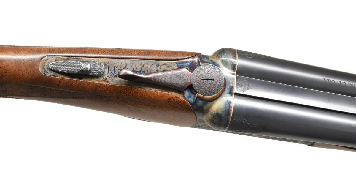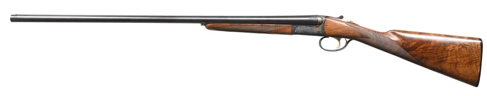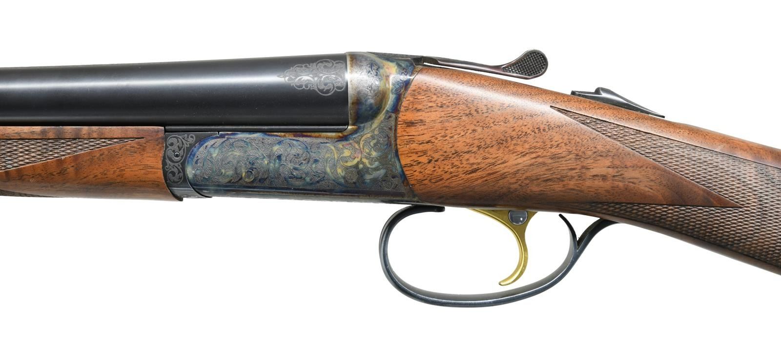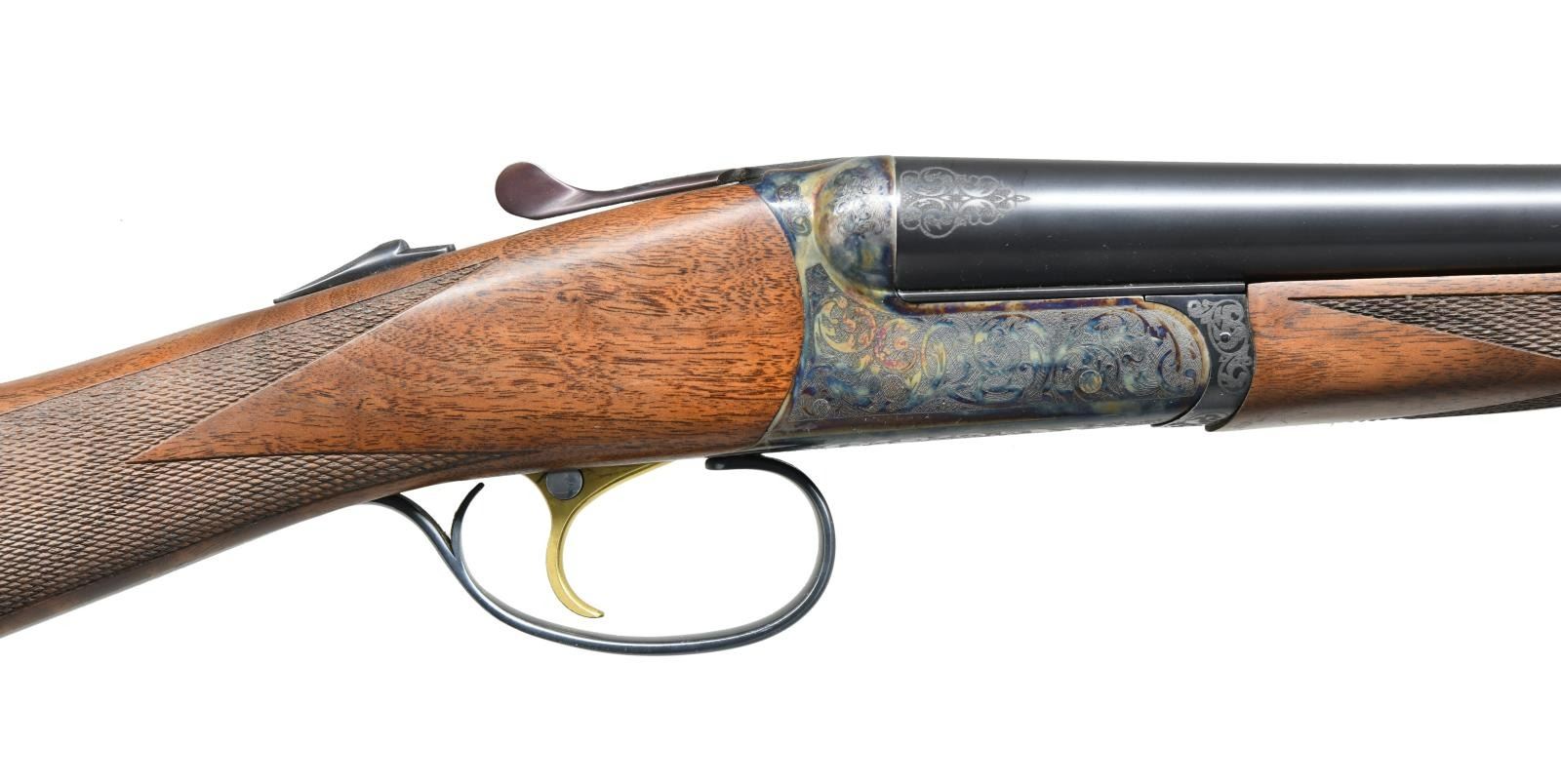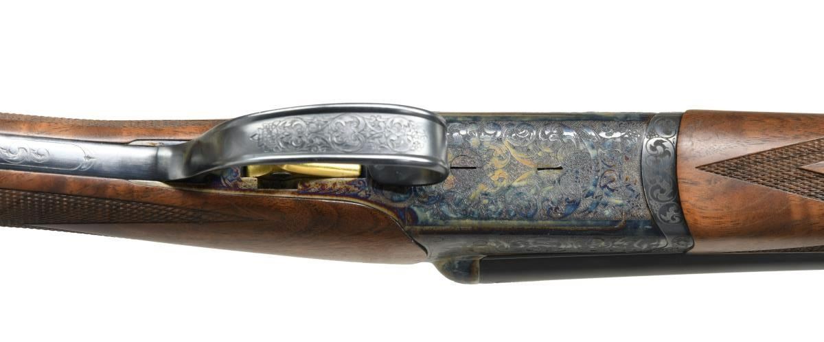 LAUNCH EDITION SXS SHOTGUN. Cal. 20 Ga., 2 3/4". S# RBL004069. The 28" rust blue bbls. w/ swamped game rib has a brass front bead; fitted w/ 2 CSMC RBL interchangeable choke tubes. The case hardened boxlock action has gold plated SST, ejectors having assisted opening & automatic safety. Receiver has generous coverage of laser scroll engraving. Dbl. beaded triggerguard bow w/ long tang. Beavertail walnut forearm w/ Anson release & wrap around point pattern laser cut checkering. Straight walnut stock w/ striking burl figure & laser cut checkering at wrist. LOP: 14 3/4" to buttplate. DAC: 1 1/4". DAH: 1 3/4". CAST: neutral. WEIGHT: 6.19 lbs. UNATTACHED ACCESSORIES: Travel case having Cabela's plaque. Leather pouch containing 3 RBL choke tubes (Full, Mod & Imp-Mod) with wrench. CONDITION: near excellent blue & case hardened metal finish w/ one brown spot on bbl. water table. Near excellent forearm wood finish. Very good buttstock finish showing scattered light marks throughout & loss of finish & scratches around buttplate. Bright shiny bores w/ light use. Case has very good appearance w/ marks. (23-4844/MD). MODERN. $2,750-3,750.