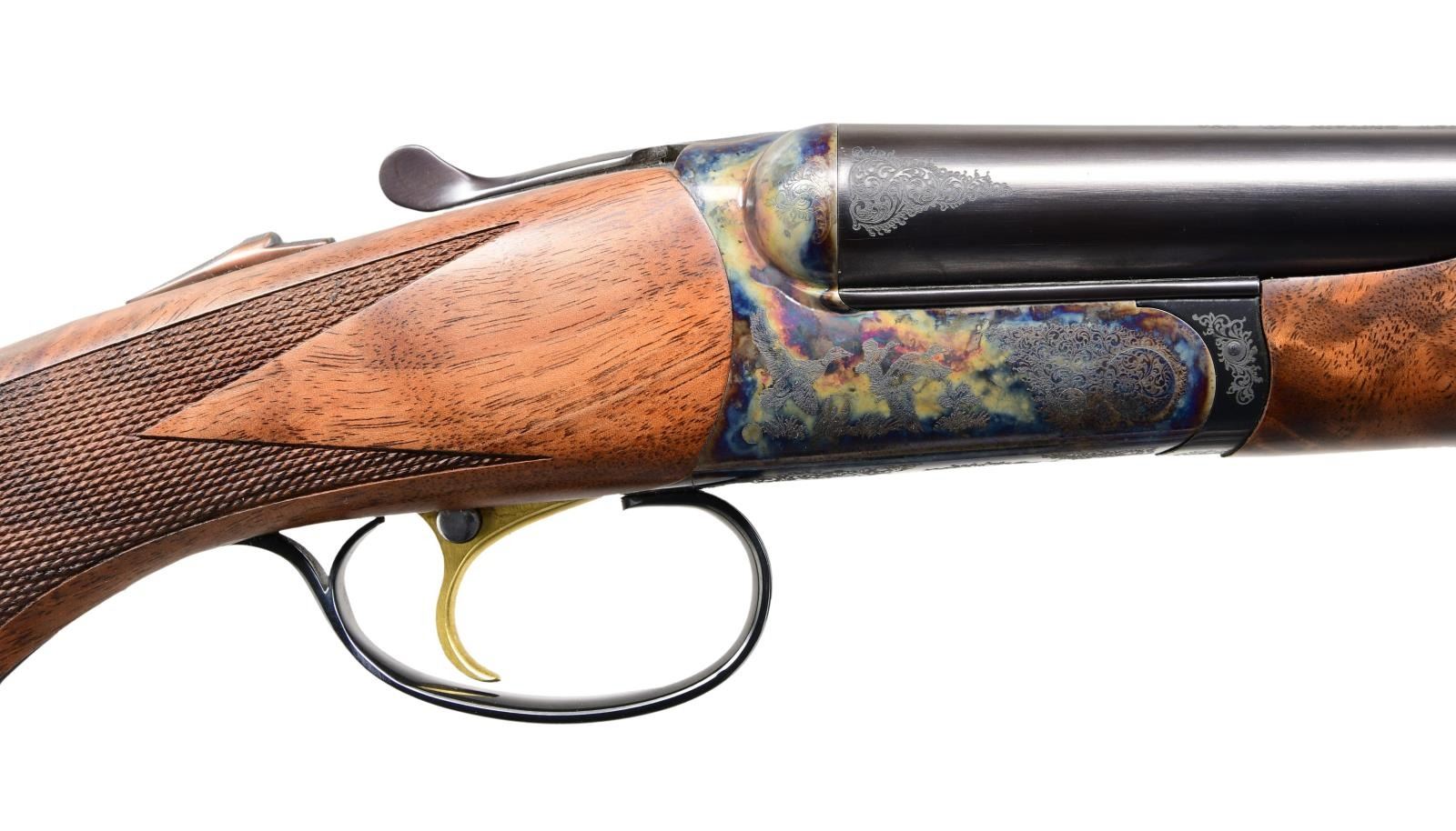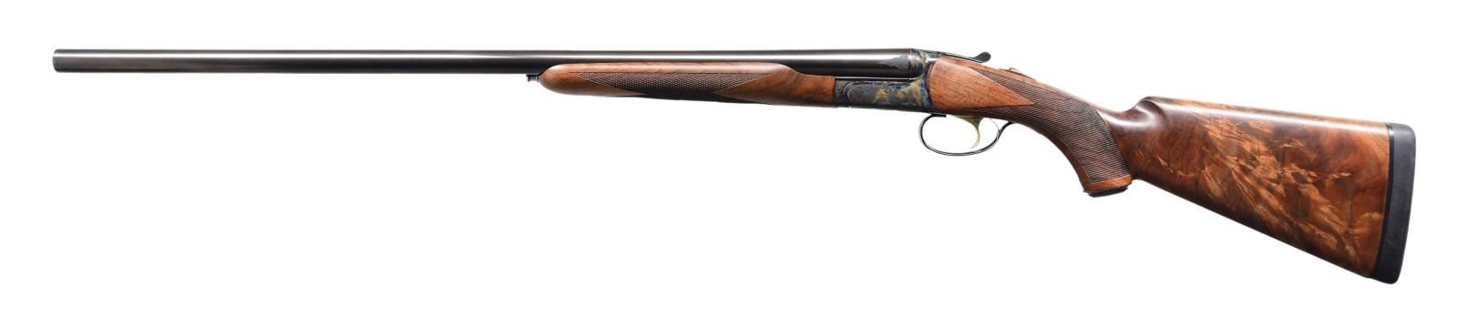 SHOTGUN. Cal. 12 ga., 3". S# RBL005253. Bbl. 28" w/ interchangeable chokes, M&F tubes included. Case colored round body action. Scroll ornamentation features mallards on right side, pheasants on left. Gold finished SST. Selective ejectors. Beavertail forearm & steel capped pistol grip stock of satin finished fancy walnut w/ cut checkering. LOP: 14 3/4" over solid black Galazan pad. DAC: 1 7/8" DAH: 2 1/2". Weight is 7 lb 6.4oz. CONDITION: near excellent. 99% blue showing sm. scratches. 99% case colors. Very good wood finish. Near excellent bores. (24-1974/DS). MODERN: $2,500-3,500.